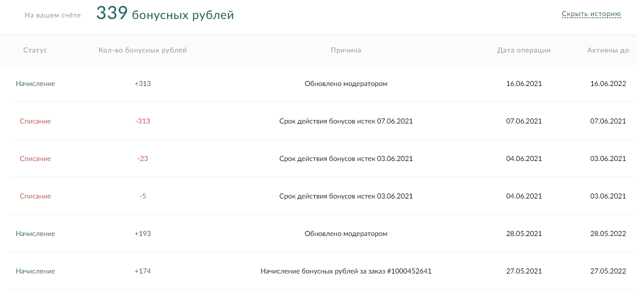 что значит не должно??? я полгода бодаюсь с Вашей службой поддержки. наконец решилось 28.05.21 вернули 193 бонусных балла, 27.05.21 начислили 174 балла за заказ. и того 367 баллов.3.06.21 непонятно с чего списывают 28 баллов, 7.06.21 списывают 313 баллов. вуаля, как говорится. мой майл vbelyalyov@ya...