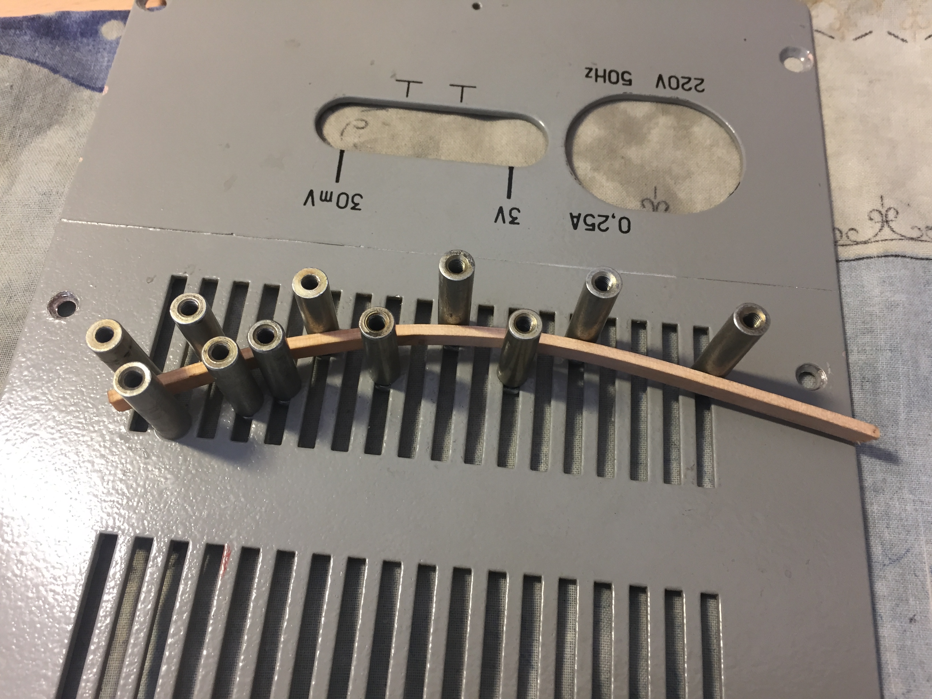 Всем доброго дня. С началом обшивки может пригодиться простейшая приспособа, так называемый "эквалайзер". Сваял буквально из подножного барахла. Задняя стенка от какого то прибора с вызерами-пазами. Стойки от КИП-овской аппаратуры. По шаблону выставляем стоечки, фиксируем их и распаренную планку зажимаем, как нам нужно. При высыхании имеем предварительный изгиб без внутреннего напряжения. Высота стоечек позволяет фиксировать рейки 3-4 за раз.