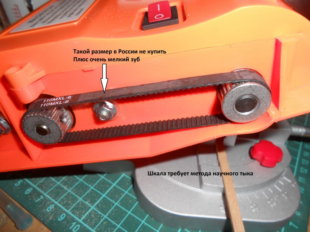 Подвод заготовки возможен только с одной стороны, тиски перекашивает при зажиме детали по пласти, точность градуировки шкалы примерна, маленькая точка опоры заготовки, пиление происходит в воздухе(как следствие недопил), нет прорези в столешнице, стол для пиления придётся дорабатывать, делать съёмным под разные задачи, нет перпендикулярного упора(обидно). Будут проблемы с заменой ремня(если таковой порвётся), размер ремня подобрать не сложно, зуб у него очень мелкий, с обычным ремнём будет сильно тормозить. Продавец указал 90вт., их там далеко нет, но если сильно не давить, справляется.