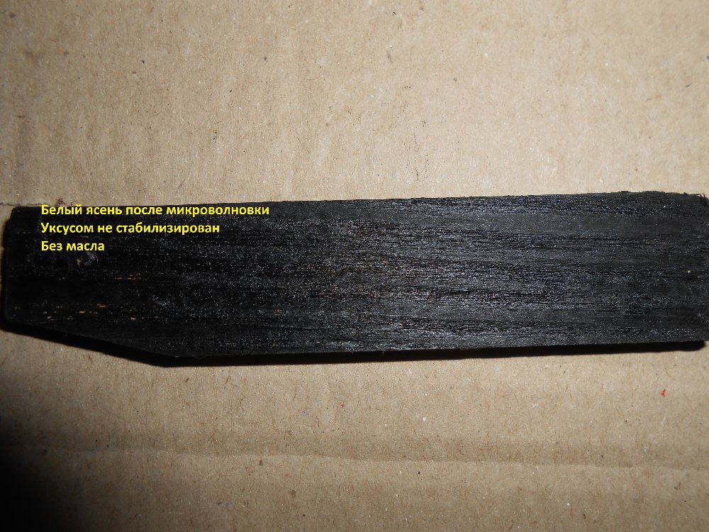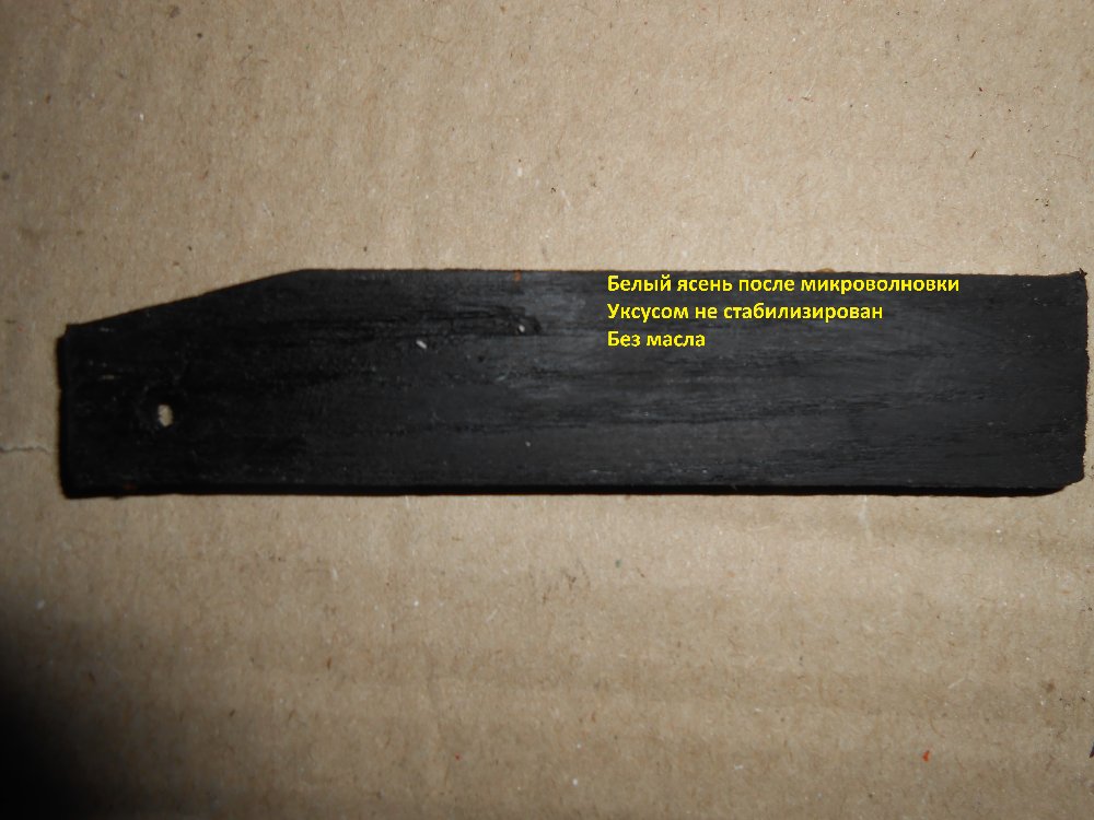 У меня сейчас нет возможности напилить планок, поэтому, отколол щепку от обычного ясеня. Процедуру повторил ту же, что с остальной древесиной. Она побывала в микроволновке, но в отличии от других, не стал стабилизировать в уксусе. На ней остался налет от раствора(цвета ржавчины), который после растирки пальцем, красится. Прошло трое суток, как видно из фото ничего не изменилось.