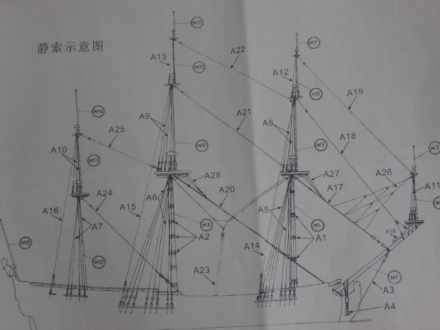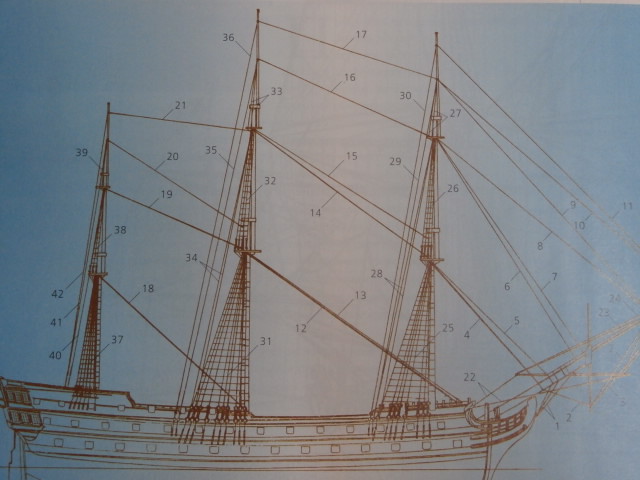 Да да, Сергей Николаевич, постер у меня висит на стене уже три года с момента начала строительства и я сразу же начал рассматривать подробности.Готов согласиться с вашими рассуждениями,но объясните мне почему блоки и фалы идут поверх вант и путенсов стень -вант?? Ведь если фалы драйрепов идут выше, к реям стеньг, логично было провести их под вантами и потом через "собачью дыру" выше к салингам соотв. марсов. Если драйреп идёт например к грота рею, то тоже надо вести блок и фал под вантами к блоку на салинге, а потом к рею. Здесь же фал упирается в настил марса, вверх ему не пройти, и куда дальше остаётся гадать. По началу я подумал что это гордени, как раз по два на половину паруса и борт (нок-г. и бык-г.), но они тоже должны идти через блоки на салингах.Вообщем сейчас это уже не важно и не будем заморачиваться.А вот идея закрепить в этих дырках коренные концы шкотов мне очень понравилась, по моему проблем с проводкой не будет.