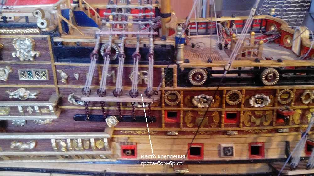 Берёт меня сомнение по поводу закрепления шкотовых углов нижних парусов при помощи шкотов за дыры в русленевых площадках нашего корабля. А зачем тогда по две дыры на фок и на грот, а на бизань они и вовсе не нужны. Чего то сдаётся мне что изначально сделаны были дырки для крепления соответствующих фордунов, обратите внимание, по проекту ДеА на фок и грот как раз по два фордуна на борт, а бизань- один Вообще это было бы правильно, но уж очень сложно работать с этими дырками.