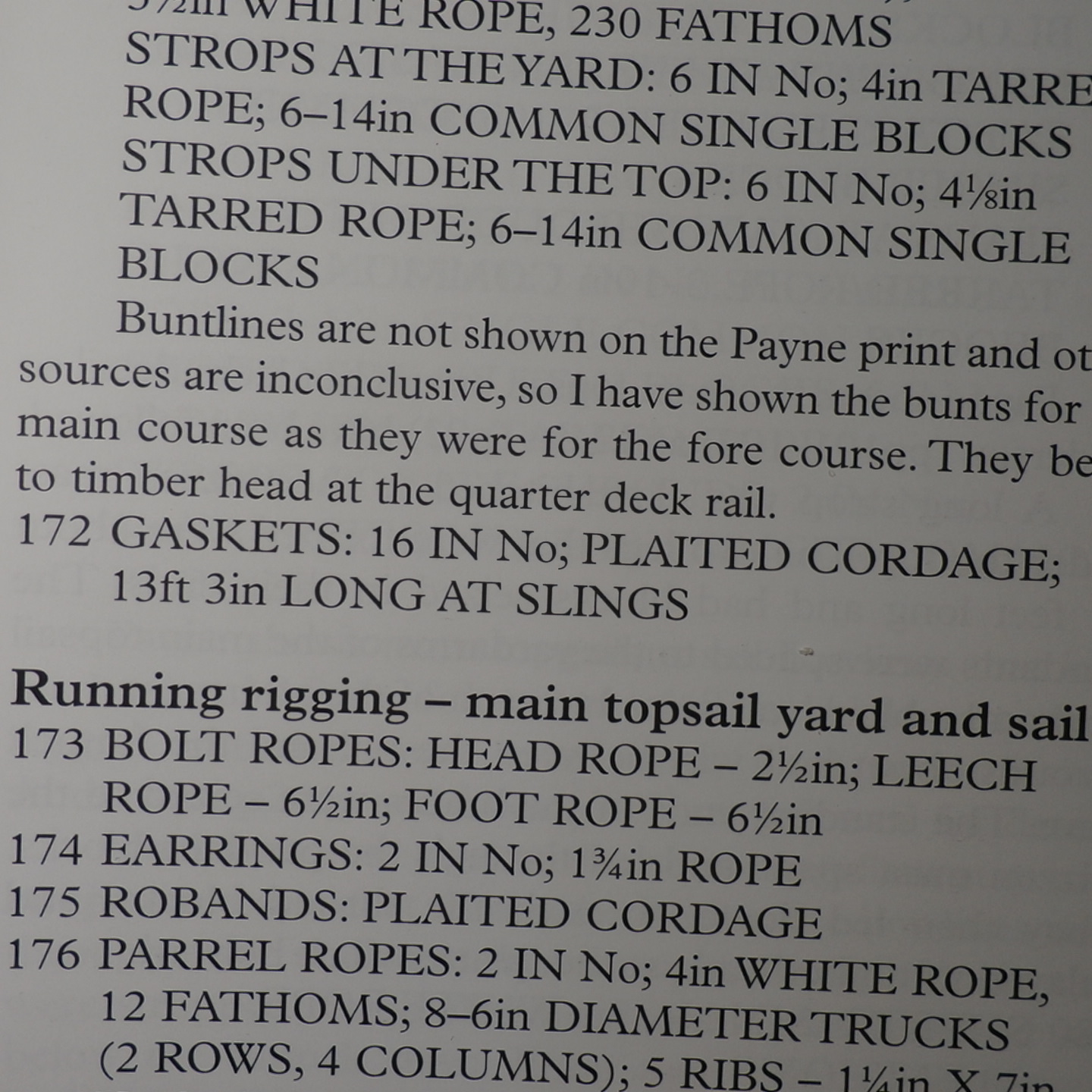 Поз. 172: Плетёная верёвка диаметром менее 16 дюймов, длинной 13 футов 3 дюйма на стропах (это мой перевод). Не уверен, но по моему это тросы горденей.А стропа это как раз петля на чертеже, как вариант держатель этой верёвки на рее.