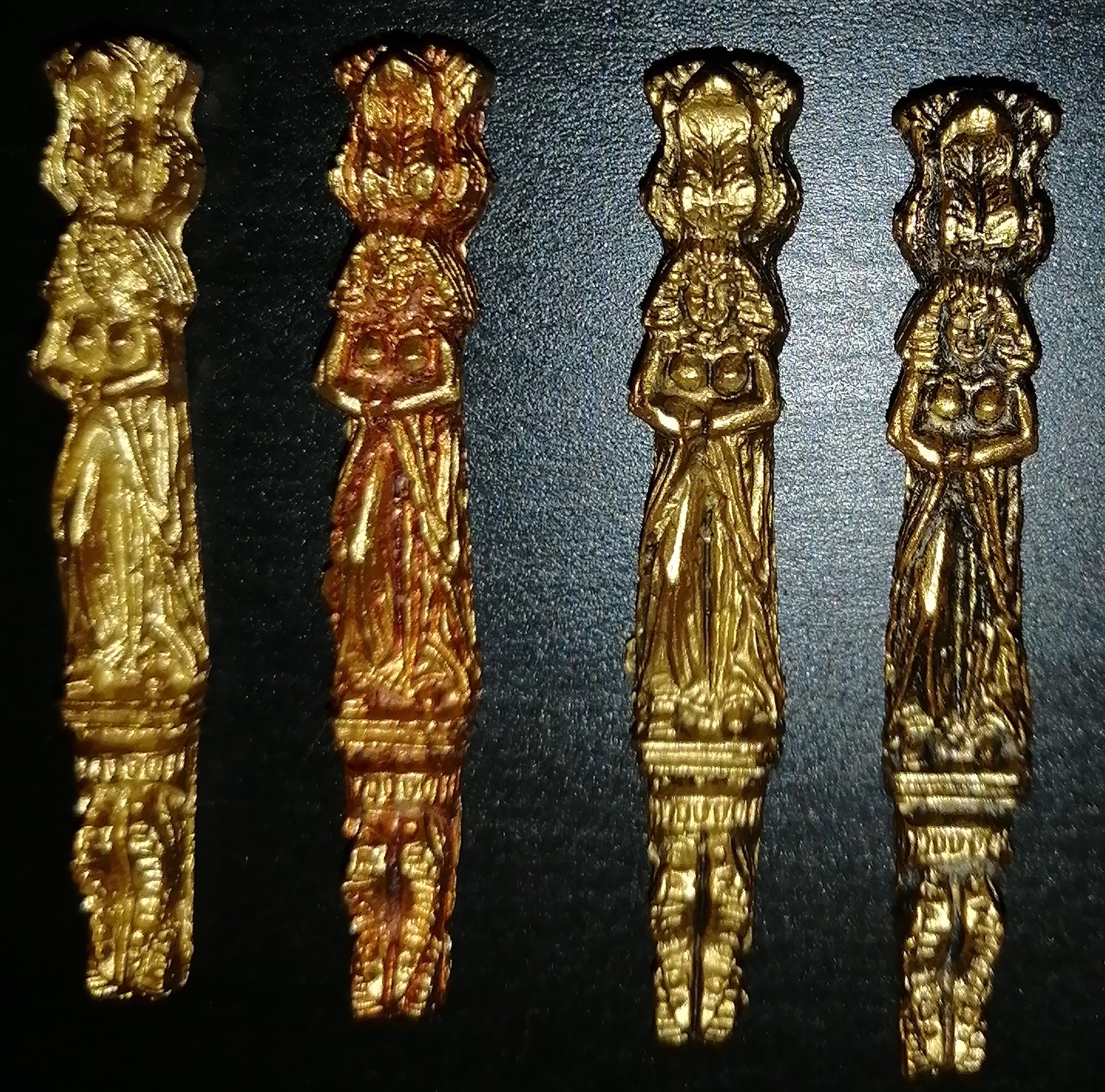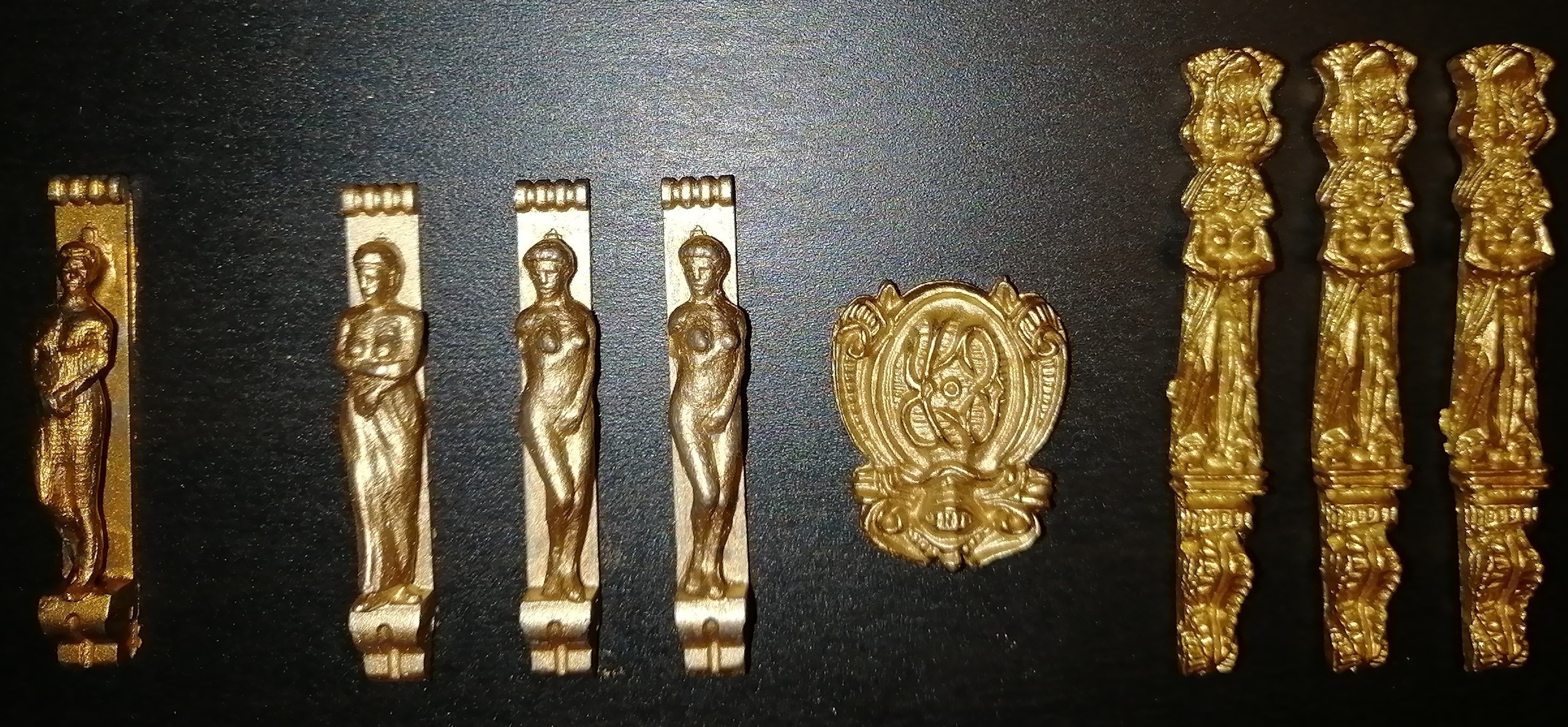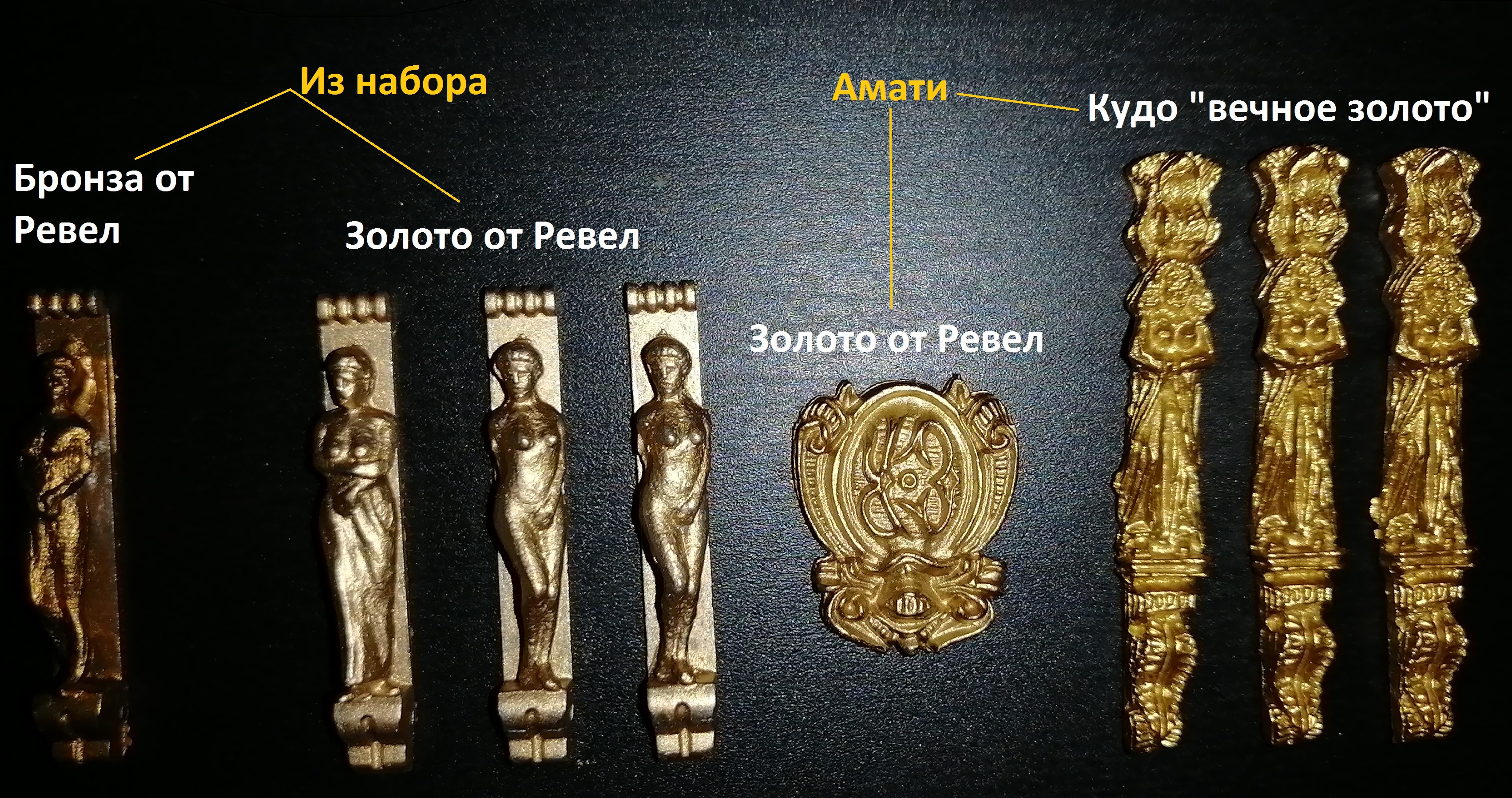 Ревеловская бронза, не подошла, уж больно бронзовая. Золото получилось лучше, для примера покрасил "бляшку" декора от Амати ревелом и добавил кариатид от туда же, покрашенных Кудо из баллончика. Конечно краска легла на серый и жёлтый металл с разным цветом, но бабы из набора, покрашены в один слой. Теперь дилема, какой цвет выбрать окончательно. Кому, что понравилось?