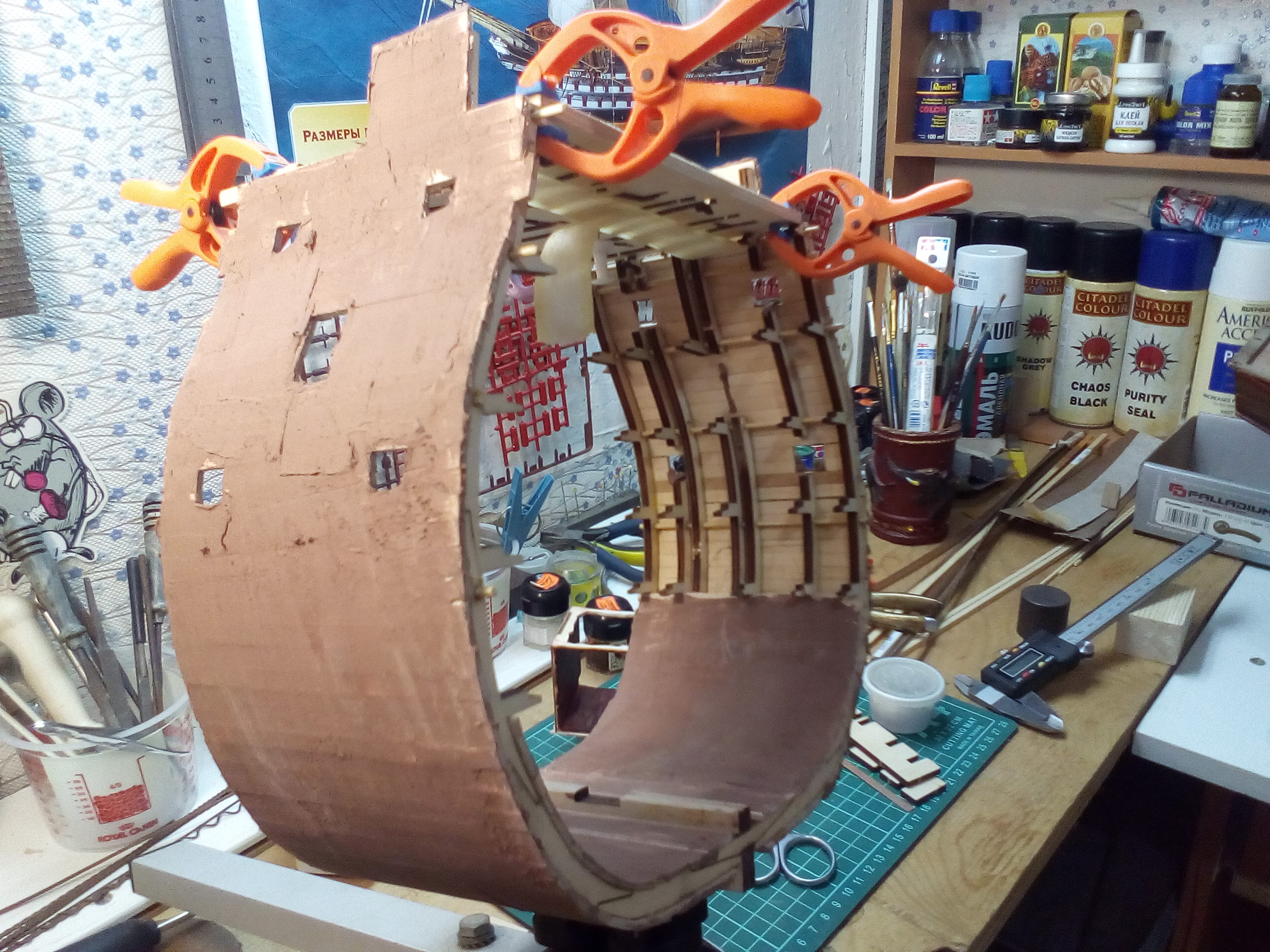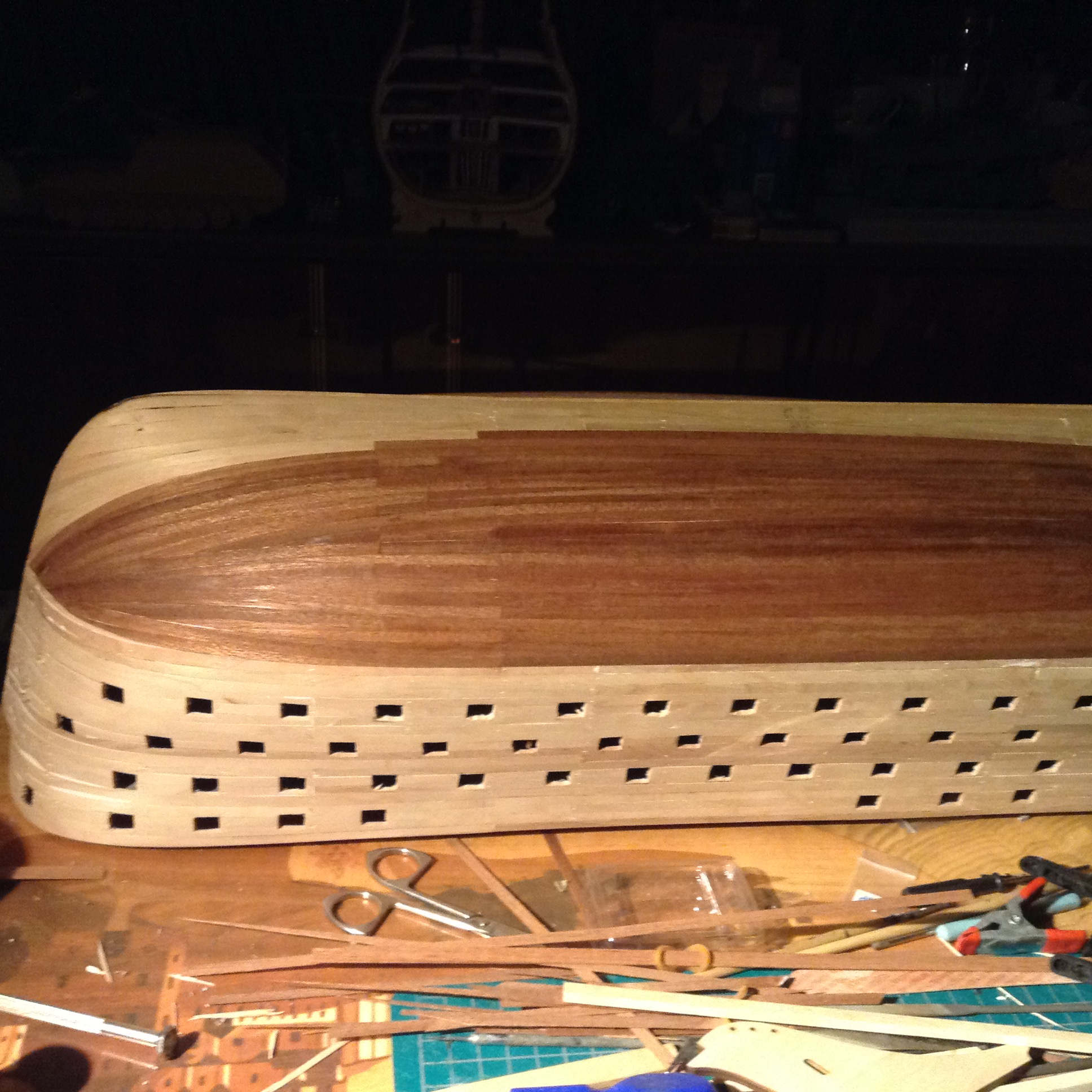 ...не делать сразу "шубу" из шпаклевки, перед формированием черновой обшивки...- после черновой. Планки клеились без гвоздевания(на этом форуме, это много обсуждалось), я противник подобного метода. К сожалению шпангоуты очень тонкие, пришлось выбирать из "двух зол".