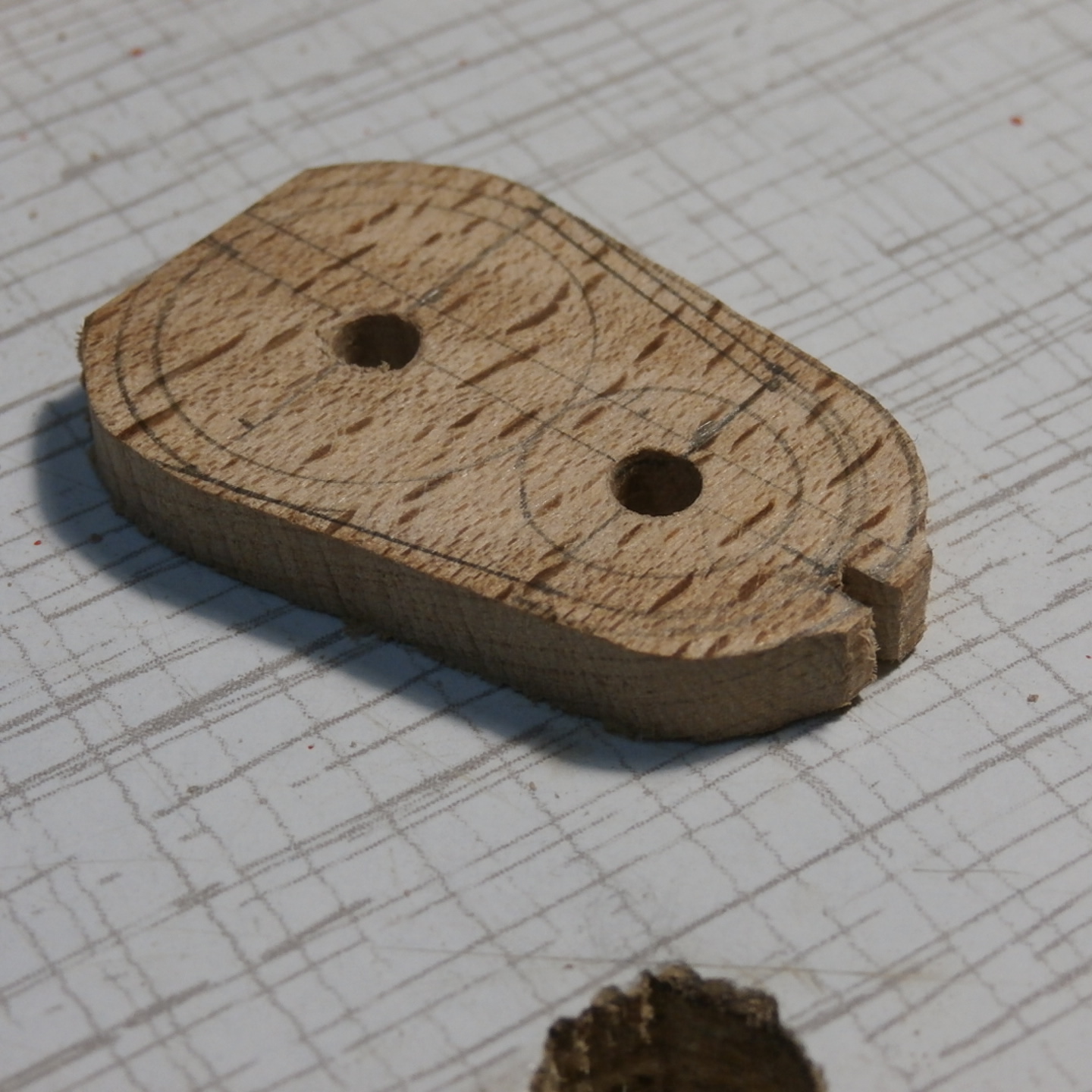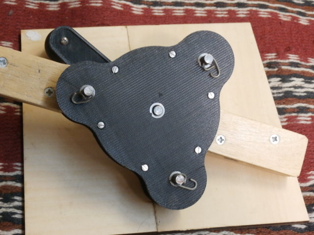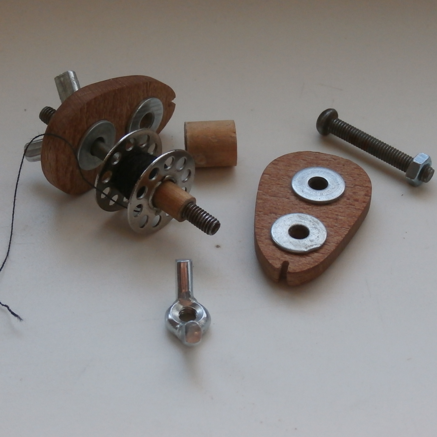 Досочка у меня толщиной 6 мм, при обточке уменьшилась до 5,5 мм. Материал годами просушенный - очень крепкий. Для регулировки натяжения нити в шпуле автор советует с обоих сторон щек четыре металлические шайбы наклеивать секундным клеем, что я и сделал. Регулировка натяжения нити получается при затяжке и отпускании барашков. Но проблема в самих барашках. Они слишком велики и далеко торчат своими рожками от корпуса клетневки, мешают работе пальцев при клетневании троса устройством. Само устройство миниатюрное. Думаю их заменить барашки на обычные гайки. Придется и менять и саму ось шпули, без барашек она получается длинной...