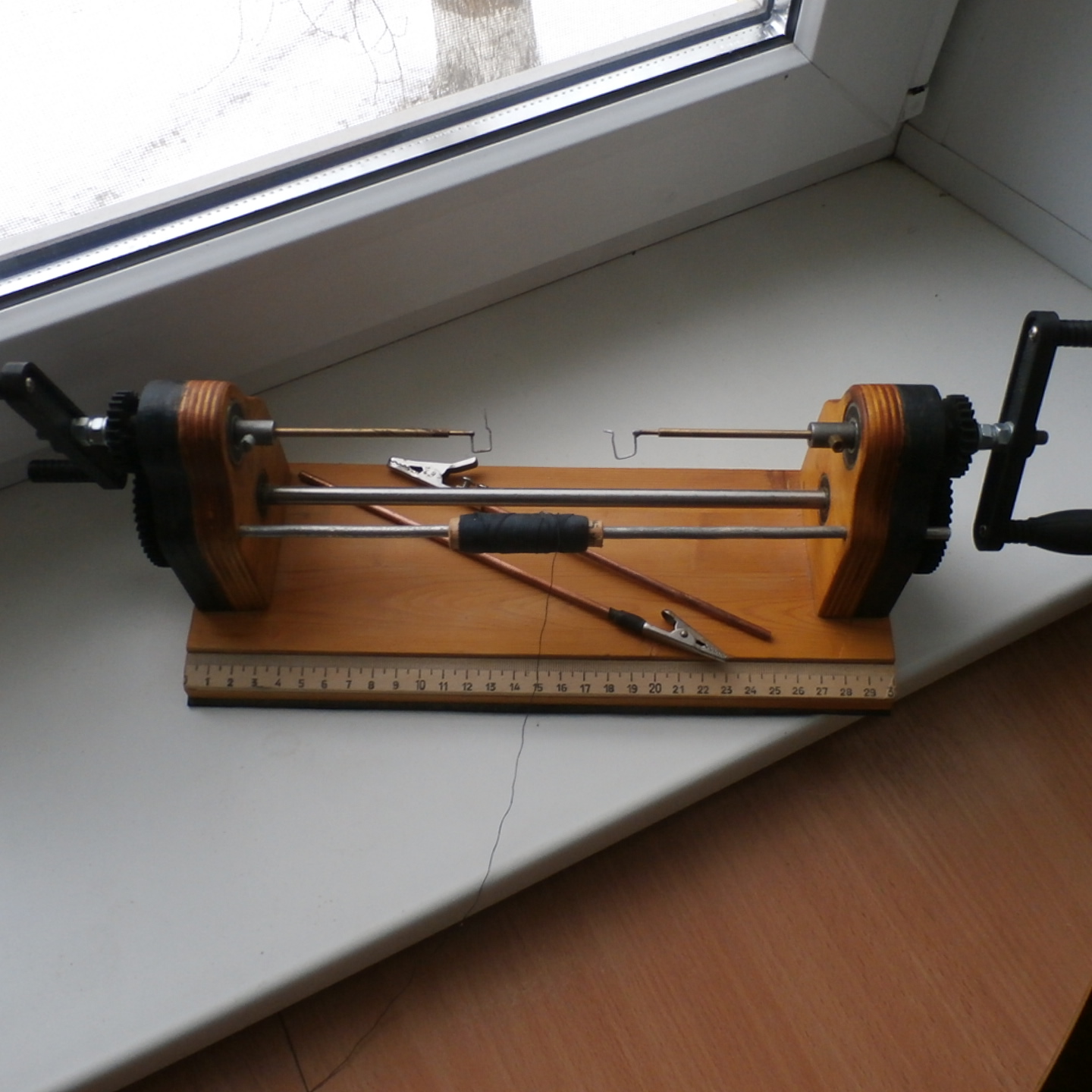 Двухпрядный трос намотать на тросемоте просто. Укрепить шурупами или струбцинкой тросомот по выше. Закрепить на тросемоте две пряди. В низу у пола связать эти пряди вместе и повесить груз. Чтобы пряди не скручивались раньше времени, нужно между прядями вставить шпулю. У меня на снимках она черная как у гитариста - медиатор только большего размера. В гранях шпули имеется проточка. Это для прядей будущего троса. Вес груза подбирается по толщине и злластичности нитей. Я приспособил запасной патрон от эл.дрели, зажав в нем гвоздик и согнув этот гвоздик крючком! Ну а на выходе , что бы получить правой или левой свивки трос - это нужно потренироваться крутя ручку устройства в разные стороны. Удачи! Если что то не получается - спрашивайте. Постараюсь ответить!