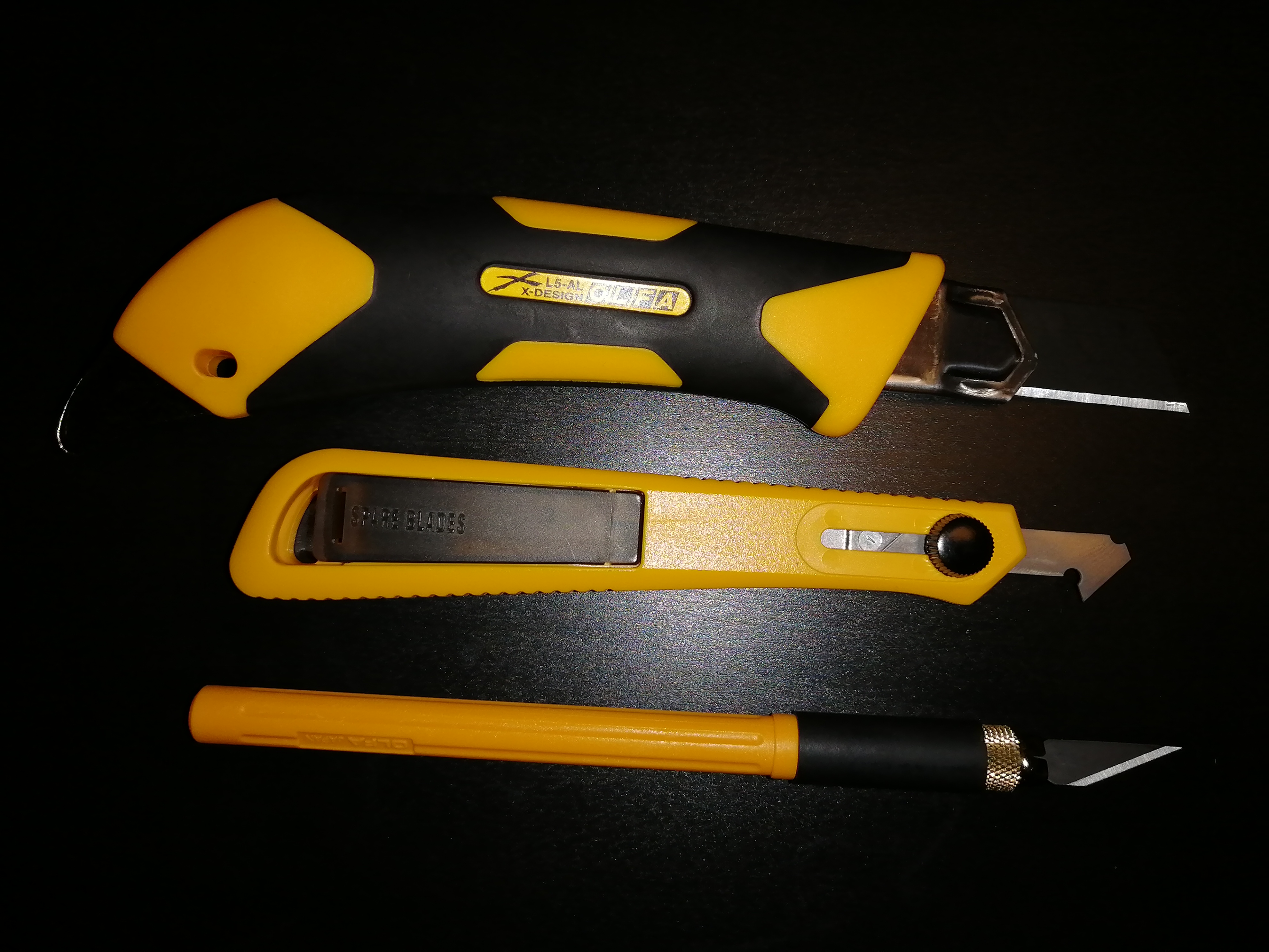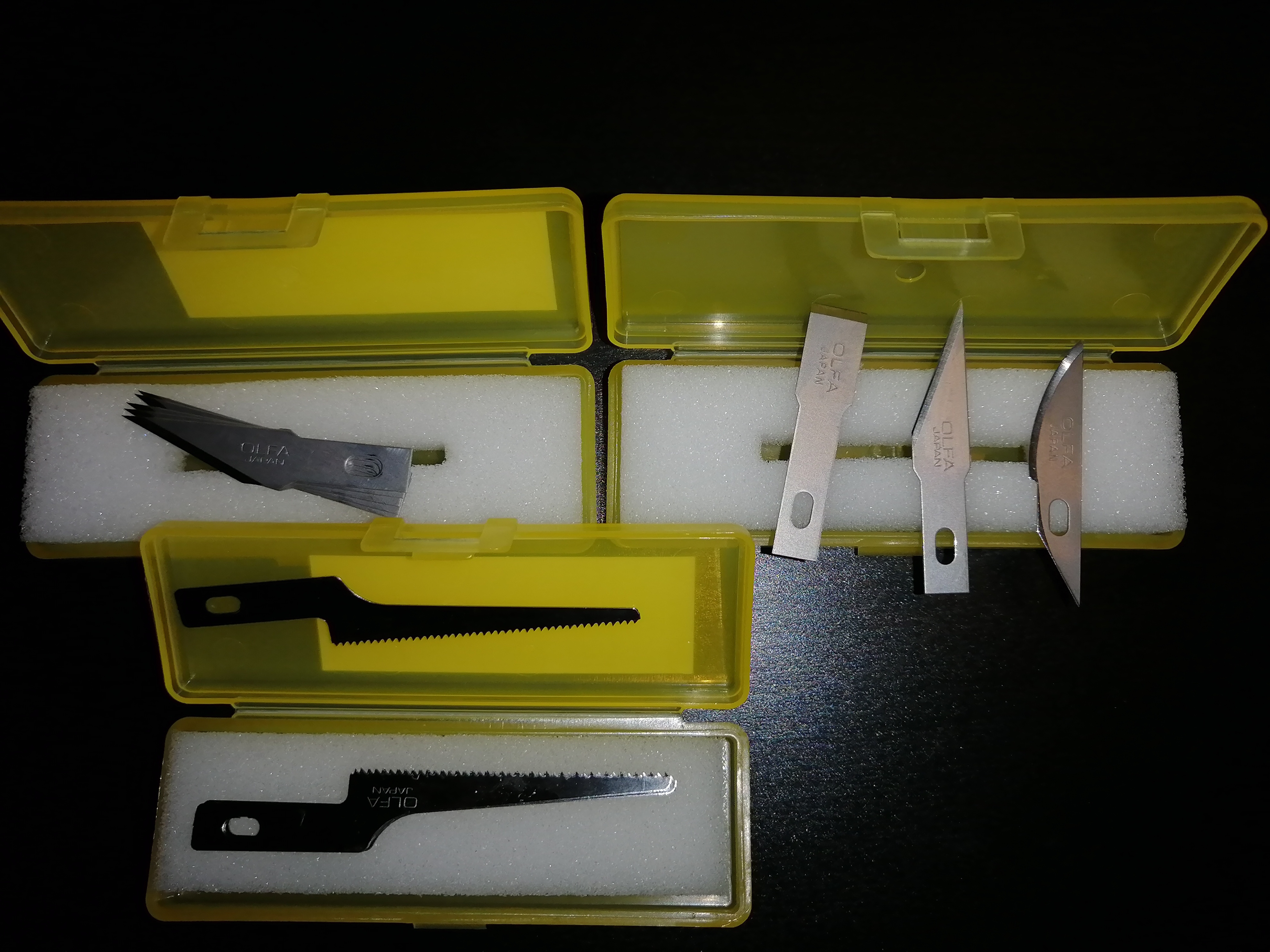 Искал в инете резак - нож, для расшивки(на фото средний). Наткнулся на японские ножи OLFA. Сразу остановиться не смог, заказал ещё нож для 18мм лезвий и "модельный" нож. Так же лезвия к ним. Восемнадцати миллиметровыми, сегментными лезвиями этой фирмы, пользуюсь по работе давно, Из доступных, самые острые и долго живущие. Модельный нож понравился, удобен в руке, жёсткий, лезвие не выскакивает. В наборе есть ещё три лезвия. У меня два Excelя, им уже лет двадцать пять, может больше, как с первого дня раскручивались, так и по сей день.