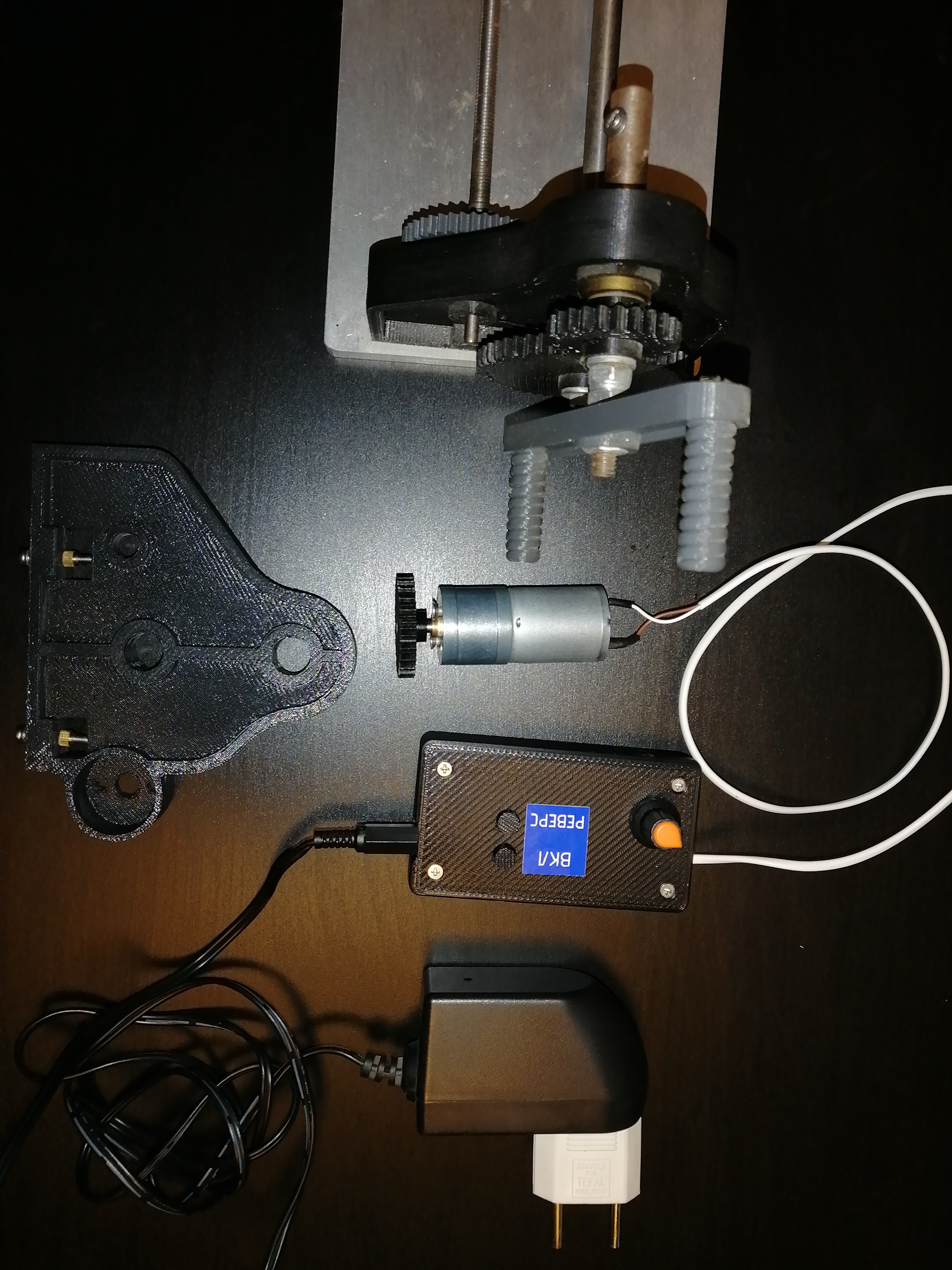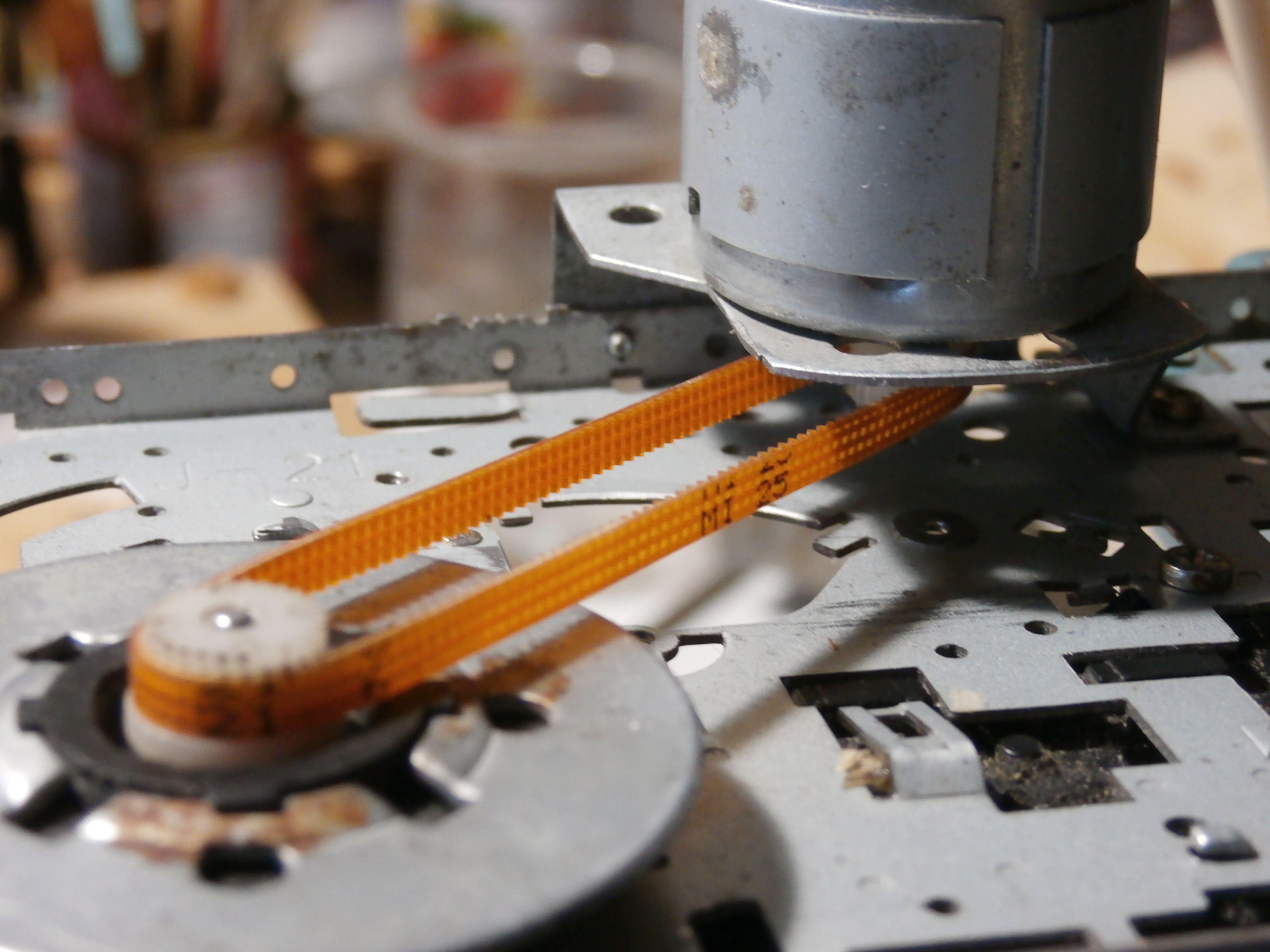 Пришлось повозиться. Заменил на более мощный мотор, взятый из испорченной эл.отвертки. У неё рассыпался аккумулятор, закоротила электроника, но двигатель исправный и более мощный. Но больше всего мне понравился приводной ремень, пластиковый с мелкой насечкой. Убрав с матрицы все лишнее я получил хорошую и я надеюсь надежную деку для будущего станочка.
