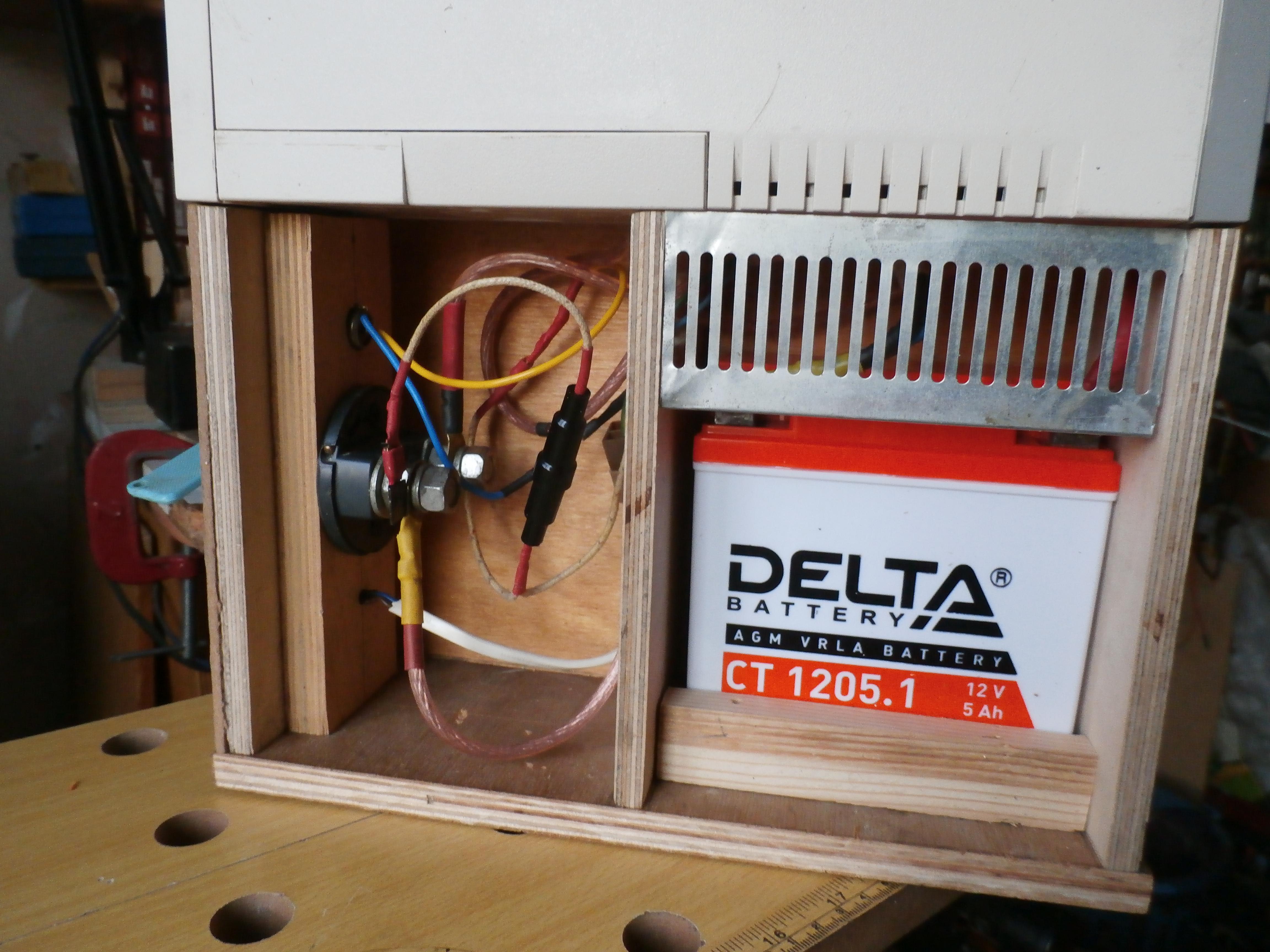 Должен предупредить, что постоянный ток - штука сердитая. При монтаже контакты должны быть хорошо стянуты гайками, все скрутки - пропаяны. Сечение проводов подбирайте по возможности по - больше. Будет меньше потерь тока. При перерывах в работе компьютера лучше отключать устройство от аккумулятора при помощи выключателя массы. Мотоциклетный аккумулятор 12 вольт 5 ампер\час.в автомагазине был куплен за 1300. Удачи всем и главное Здоровья!