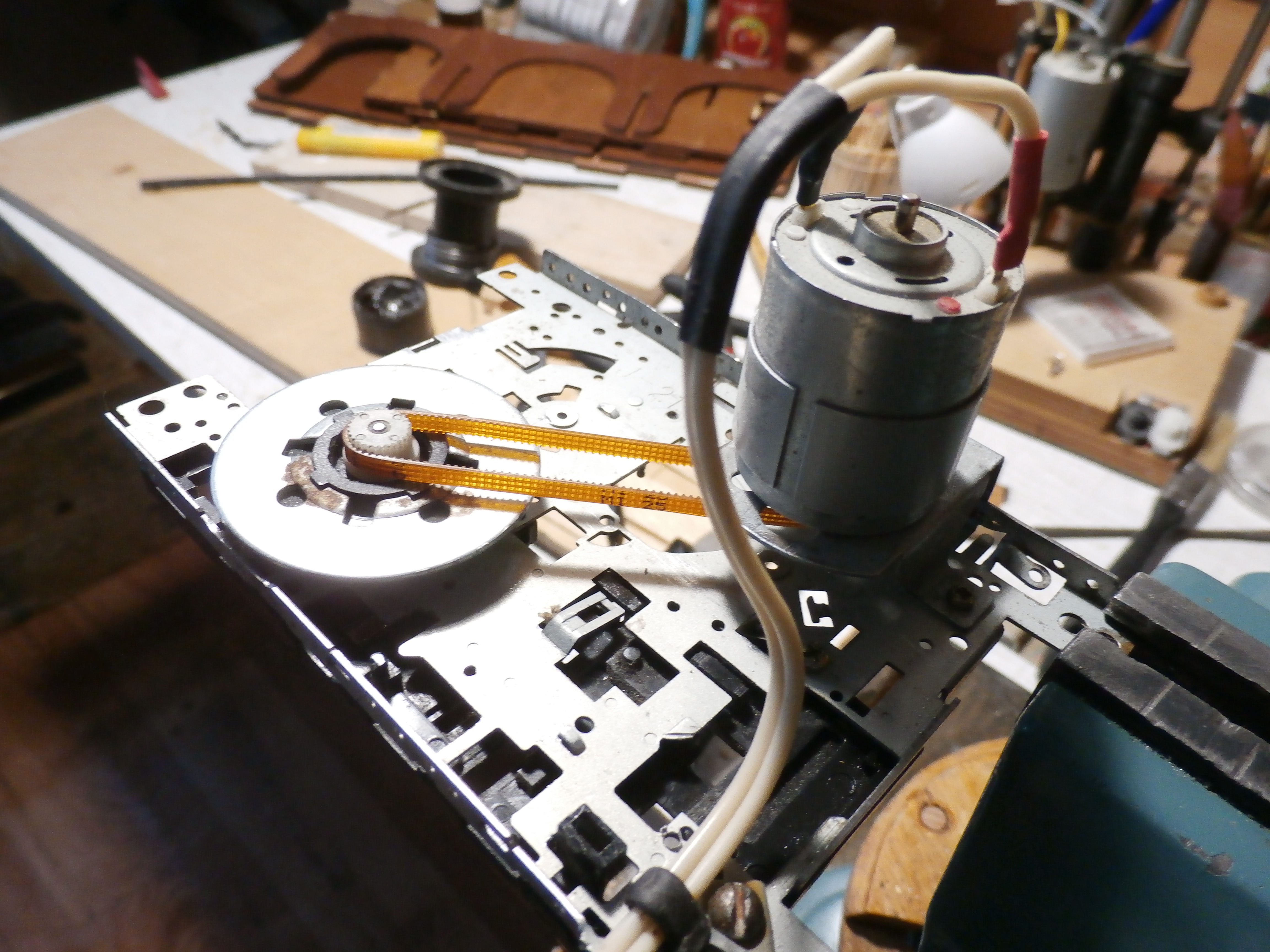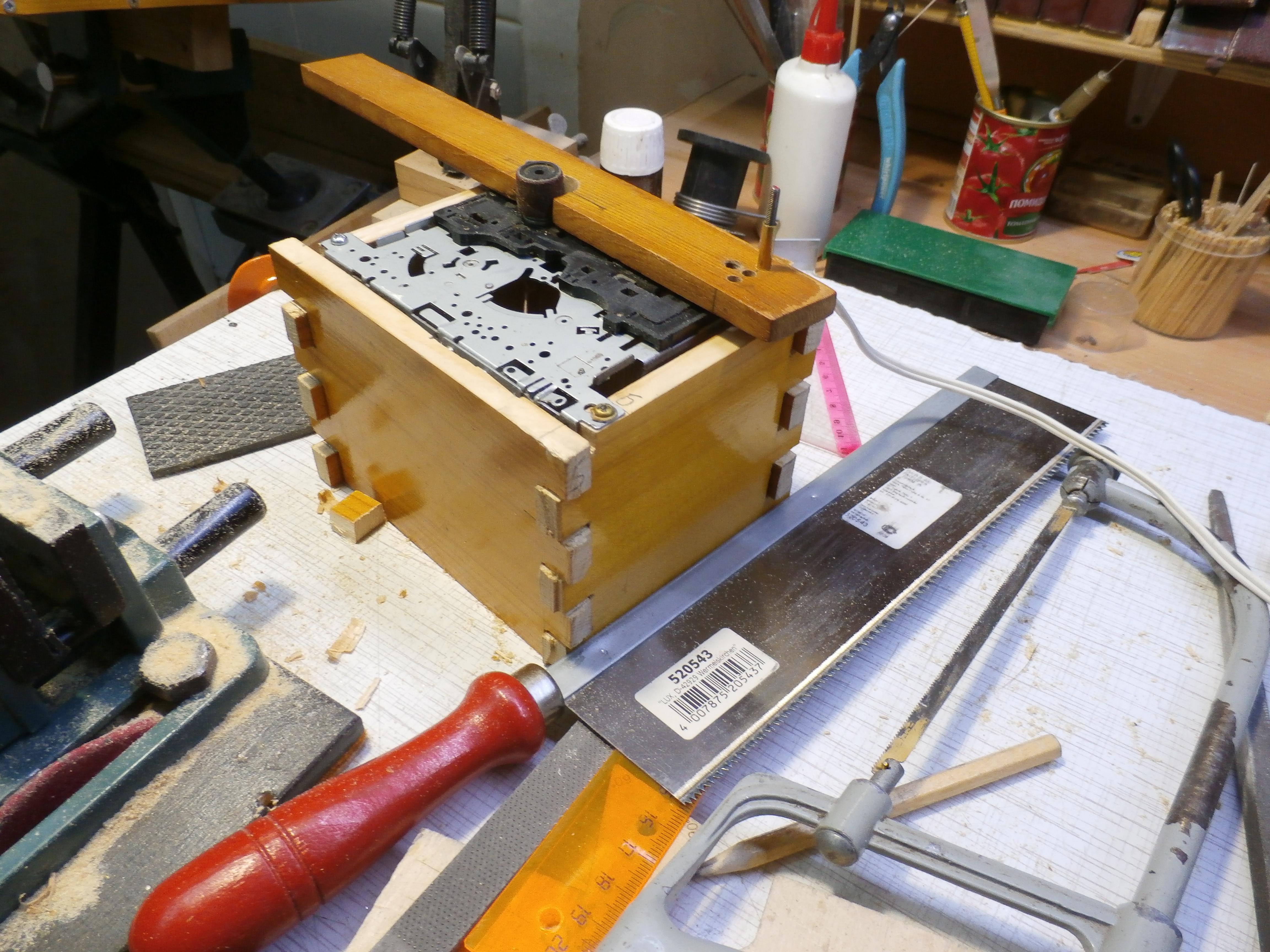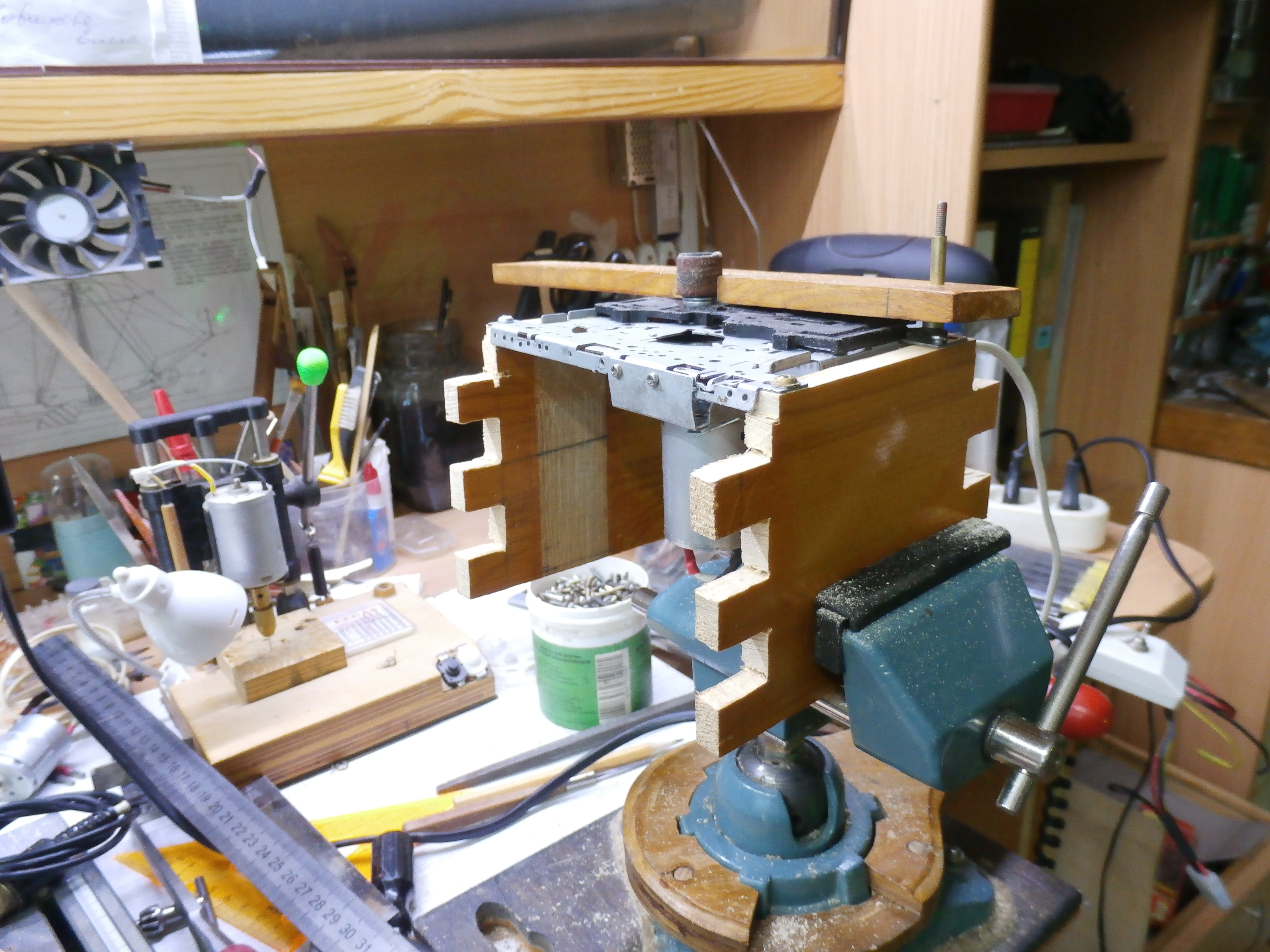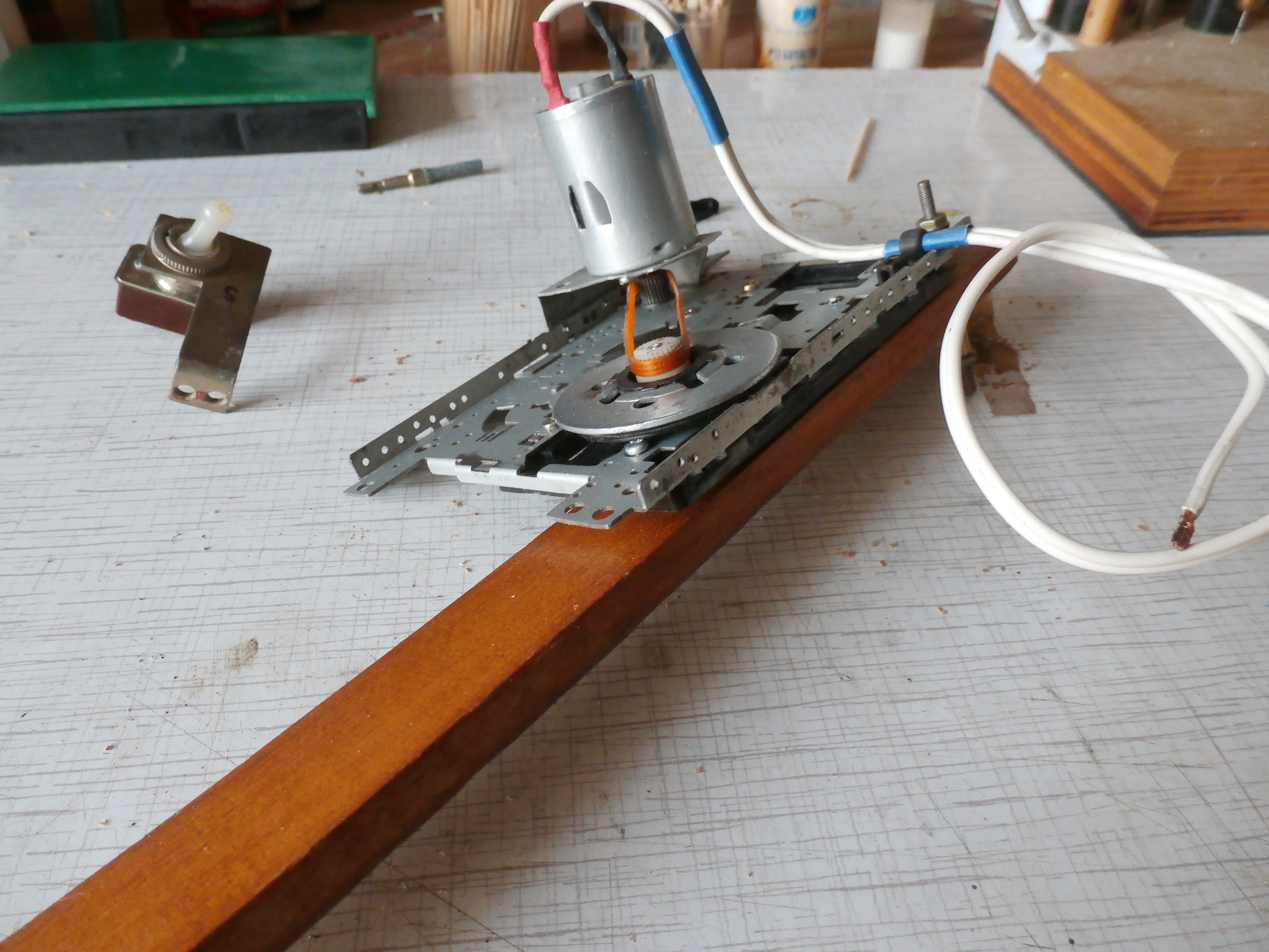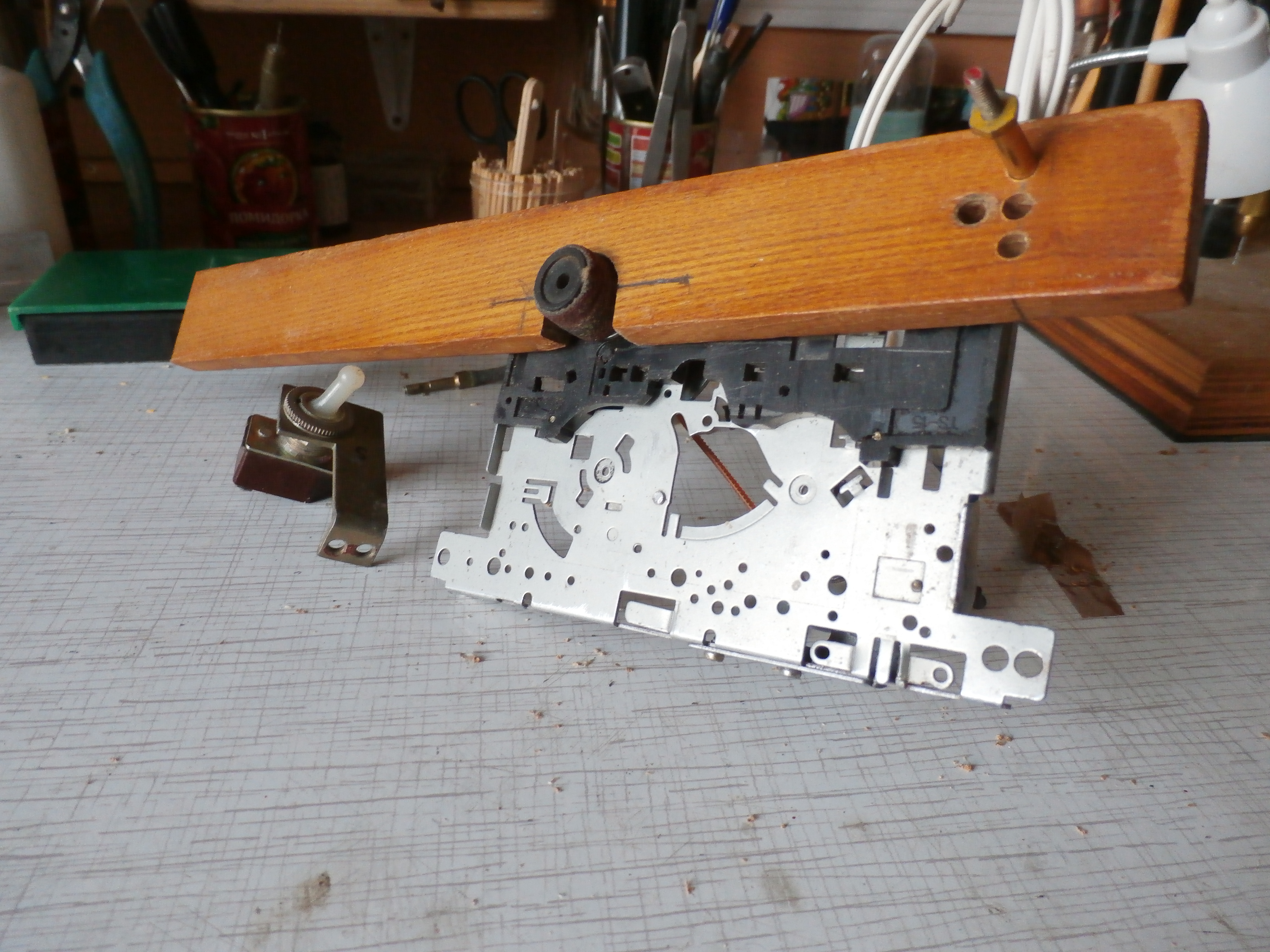 В моих запасах очень давно кувыркается старый магнитофон-кассетник. Кассеты давно испорчены и потеряны, но сам магнитофон мне дорог - как память о моём отце. Его наградили этим магнитофоном как Отличника БП и ПП. Магнитофон довольно большой и занимает много места. Вот я его и решил пустить в дело. Силовую деку - матрицу - механизм для перемотки маг.пленки в кассете пустить на устройство микро станочка, который будет у меня стачивать и зауживать и подгонять по размеру планки чистовой обшивки корпуса модели, верхней палубы и т.д.
