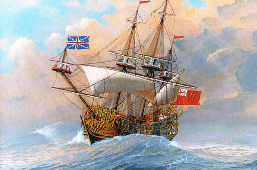 О бумажных флагах для своей модели я отметаю сразу. Строить свою модель волею судьбы пять лет и навесить на неё бумажные картинки, в место королевских штандартов я просто считаю - кощунством. Бумага - материал слабый и в соединении с комнатной пылью быстро обветшает и потеряет свой реализм. С задачей сохранить форму развевающегося флага, я в какой то мере надеюсь справился. Как пример посылаю вам фото своего флага, где модель с этим флагом живет уже около пяти лет. За это время мой Флаг на модели не потерял форму. Технология изготовления довольно простая: Пропитка ткани (флагдуха) клеем ПВА. Клей развел мертвой водой (кипяченая - лишенная споров, микробов и плесени) до концентрации жидкой сметаны. Пропитанный клеем флаг уложил на специальный кондуктор в виде куска фанеры с наклеенными поперек мелкими рейками в виде тельняшки. Дал просохнуть в таком виде ну не мении суток, а затем еще раз пропитал флаг тем же клеем и высушил его на кондукторе. Но это флаг, где соотношение сторон длины и ширины не слишком велики и совсем другое дело, когда разговор заходит о вымпелах. Вымпелы - украшение для любого корабля и любой модели! Но как их закрепить, что бы они гордо развевались, в след за ветром по горизонтали, а не болтались, как эти несчастные моряки на реях этой английской шхуны? Тем паче: Вымпел нельзя просто приклеить к ноку рея. У каждого вымпела был свой персональный микро рей, который привязывался в месте с вымпелом за шкертик к ноку практически каждой корабельной реи корабля. Нас выручает лишь одно, вымпела поднимались в особых, торжественных и исключительных случаях! На пример при королевском смотре корабля. Представляю, сколько
