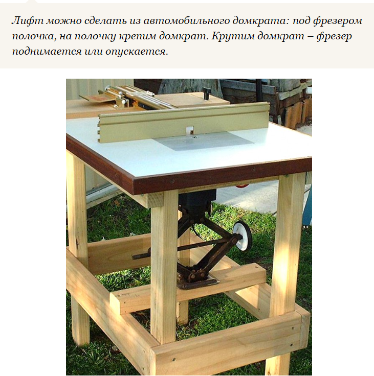 Мне то же понравилась идея с авто домкратом. Нагрузки по регулировке и поднятию фрезера - небольшие, а значит вполне возможен вариант использования самодельной конструкции из буковых (дубовых) брусков, листа строй.фанеры и прутка с нарезанной на нем резьбой.