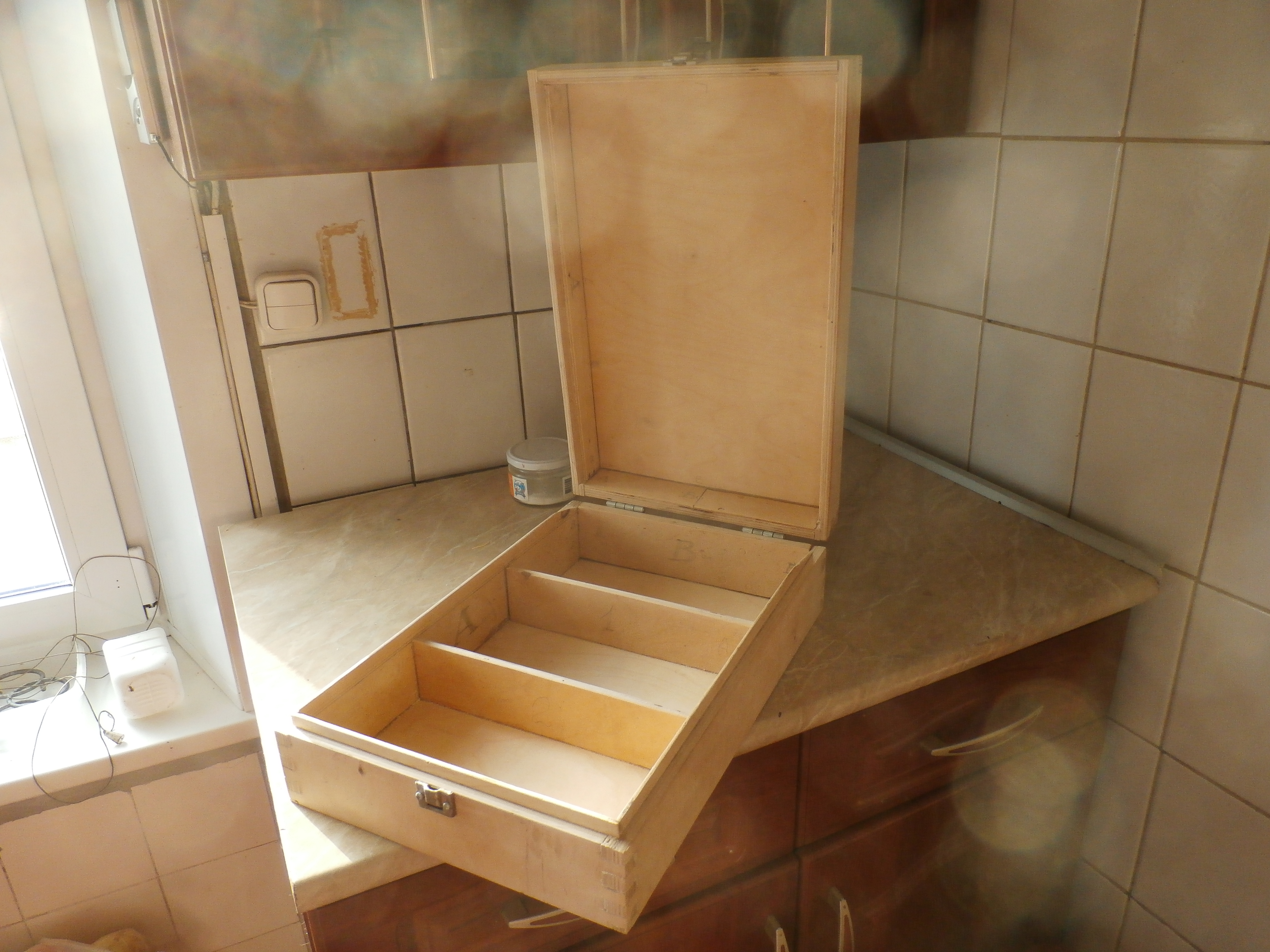 Я с начала 70 годов (прошлого века) работал на мебельной фабрике. Тогда в моду вошли портфели "дипломат". Купить их было тяжело и мы делали их сами. Чтобы крышка и основной корпус были одинаковы мы делали общую коробку, наклеивали донья, шлифовали весь ящик со всех сторон, а потом дисковой пилой делили его на крышку и корпус. В этом случае и стык между крышкой и корпусом имеет минимальные щели и даже если коробка была кривая крышка и корпус хорошо друг к другу подходили. Надо только отметить до распила одинаковые стороны крышки и корпуса.