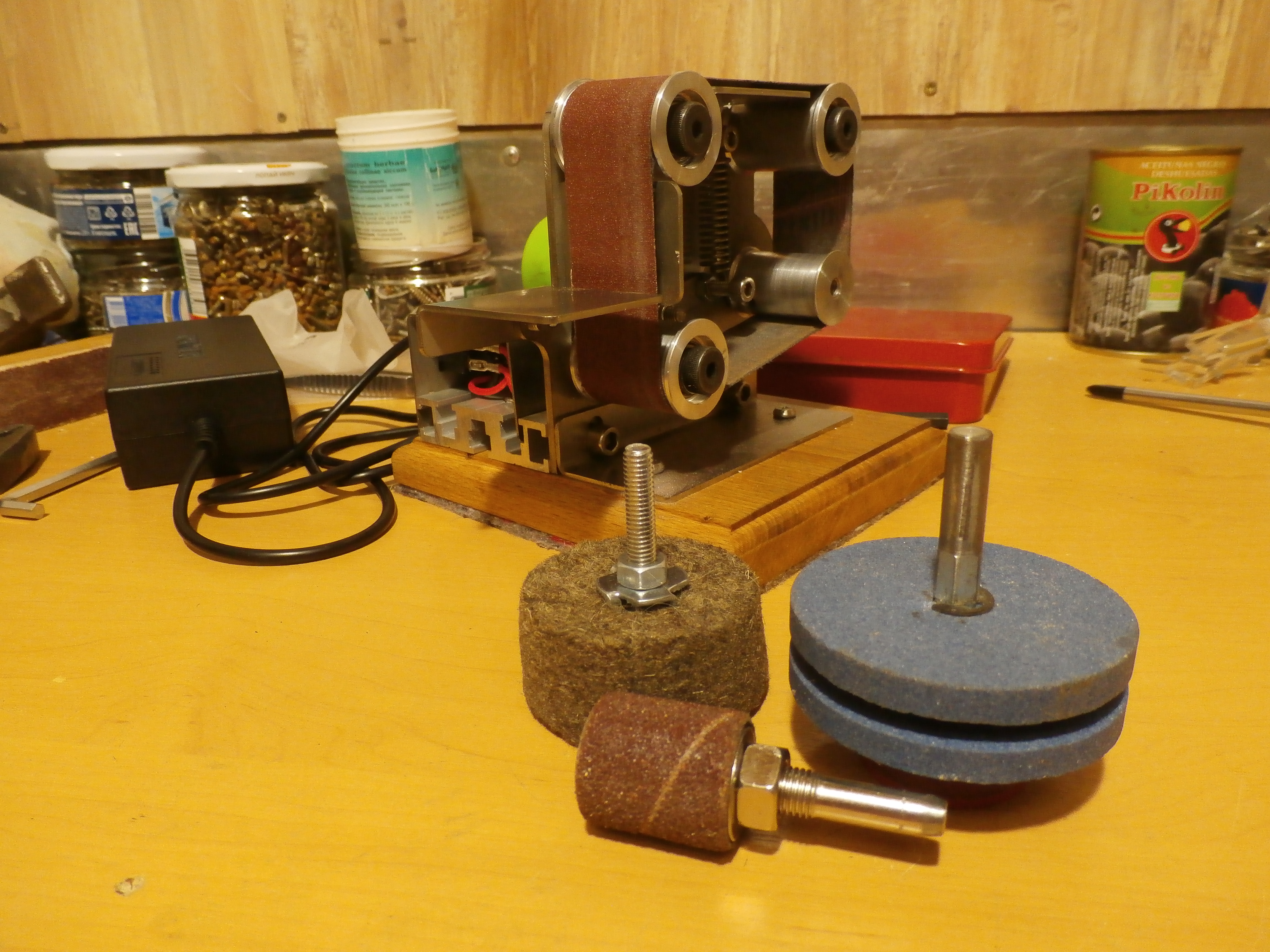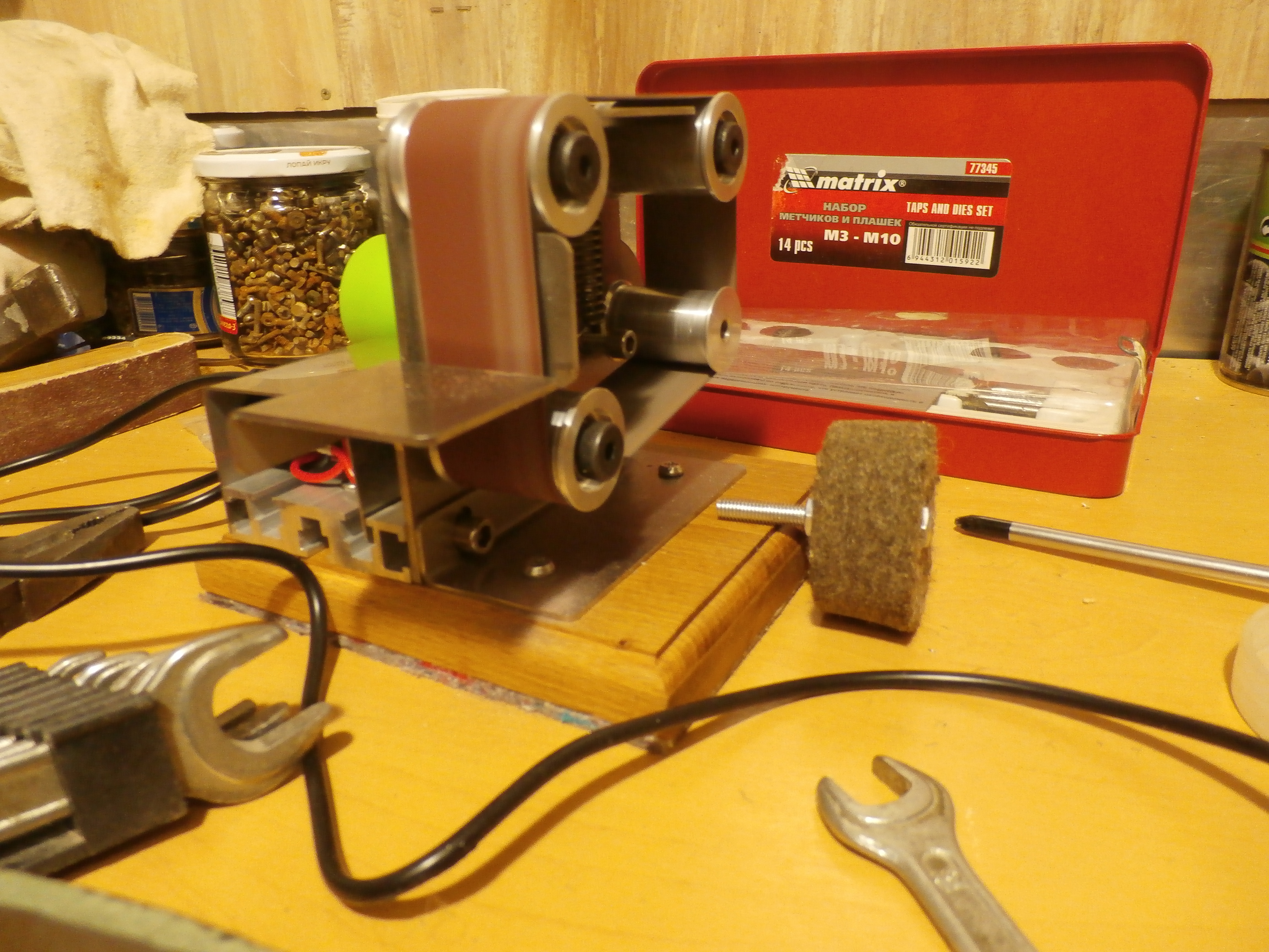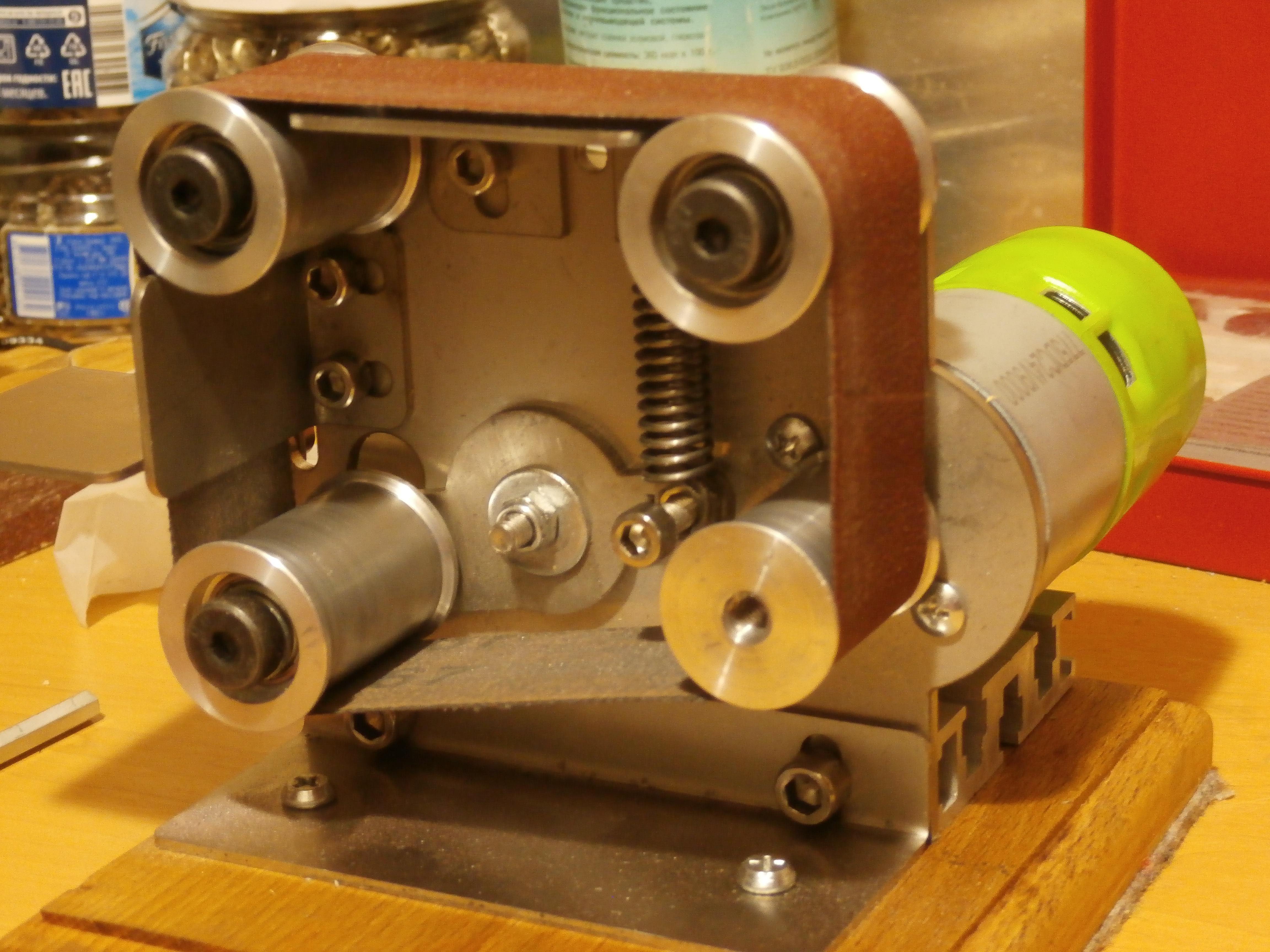 Положительные черты станка. Изготовители не пожалели материала. Нержавейка , алюминий. Станок получился крепким, симпатичным. все валы собраны на шарикоподшипниках. Дается в запас 10 лент различной зернистости.