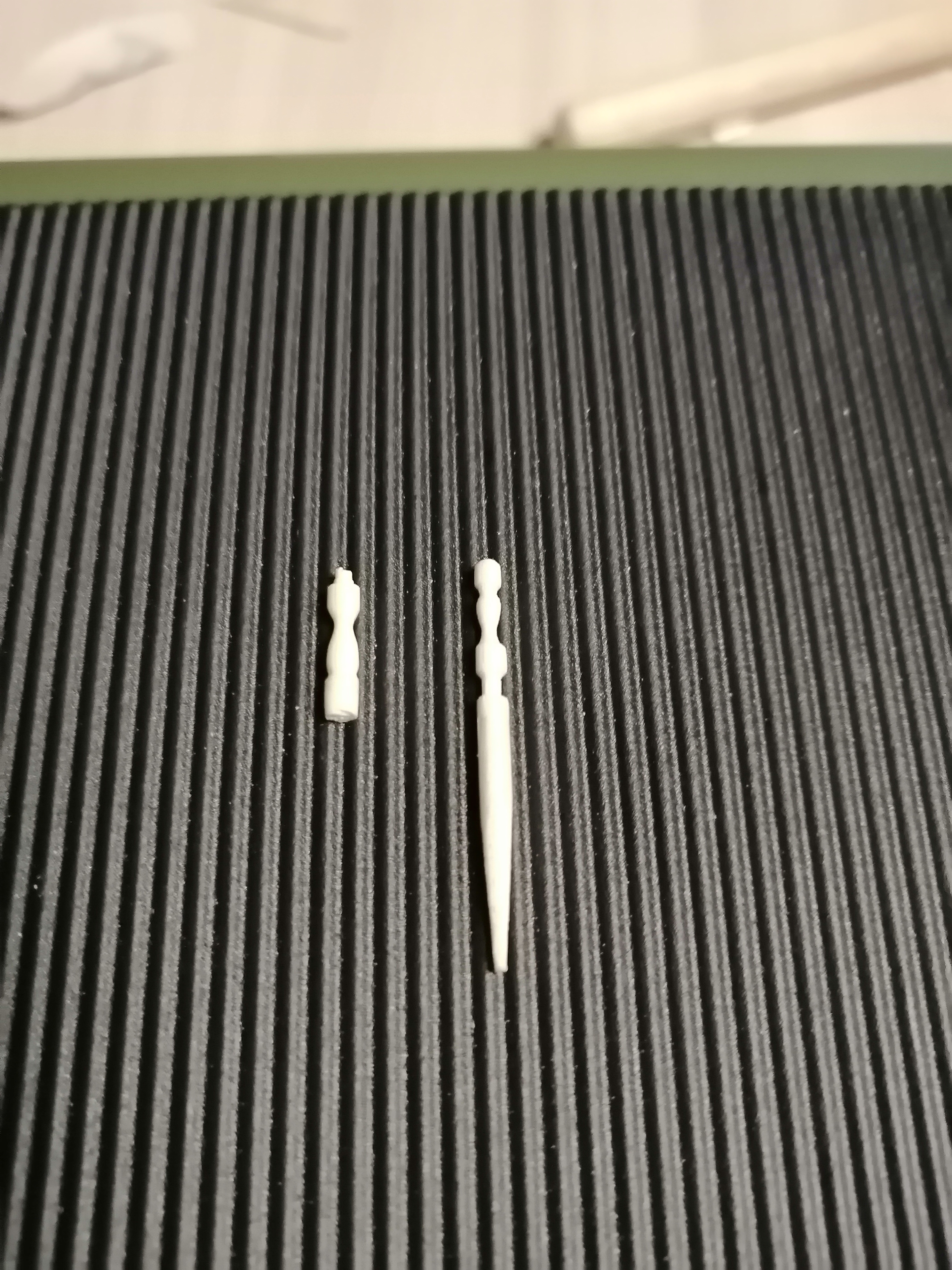 Тут не много попробовал точить балясины для трапов. До трех миллиметров, получается. Индивидуально, по одной, две не проблема, а вот масовку, как то не получается. Все дело в том что, балясины нужны именно на наклонные части трапов должны быть около двух миллиметров в диаметре. С этой толщиной заготовки, ни как не хотят быть ровными и одинаковыми. Из древесины использовал зубочистки берёзы, бамбука, бамбуковые шпажки пропущенные через лерку М3.