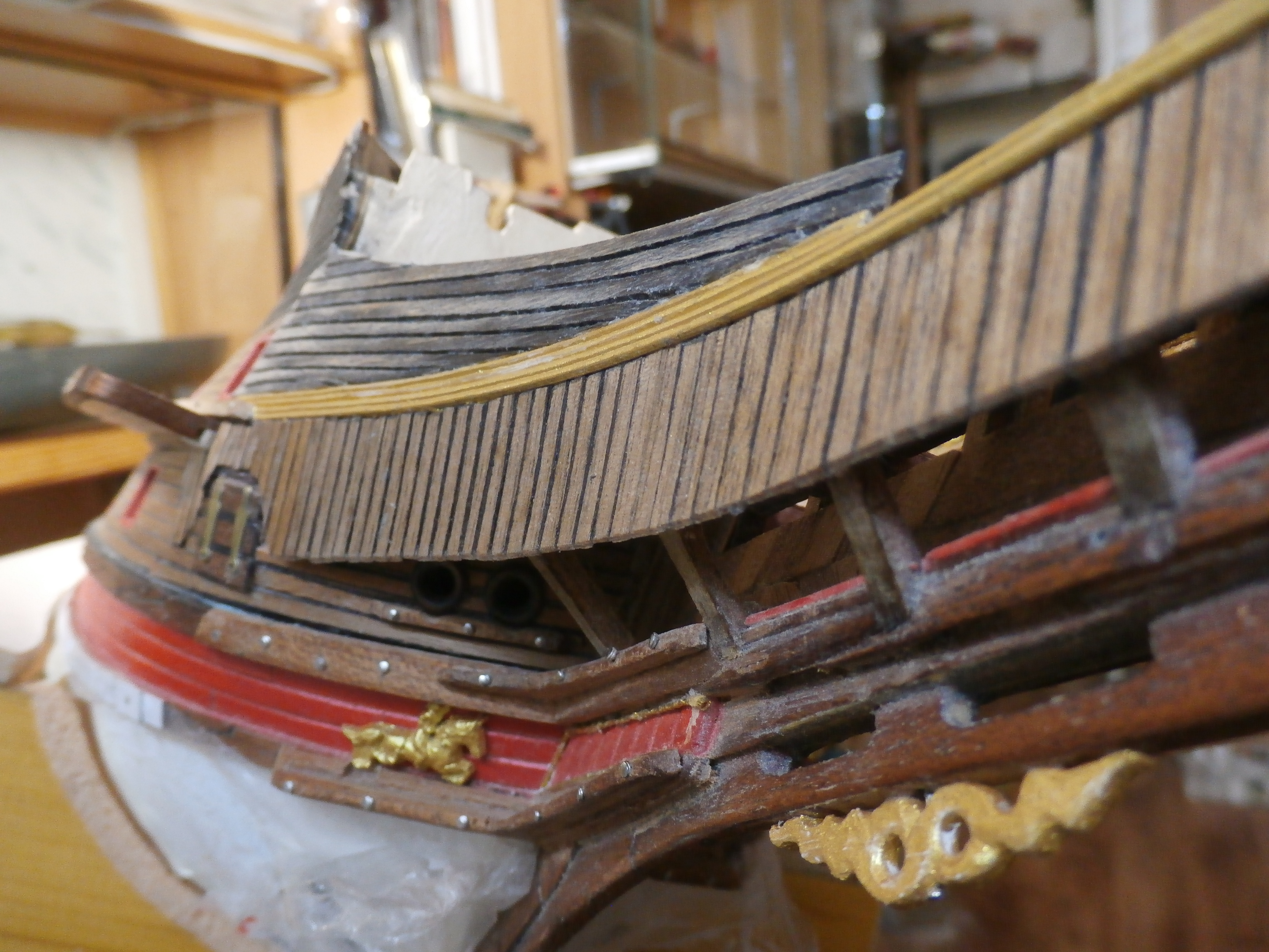 Думаю Алексей Владиславович прав. Нужно торцы, а при возможности все шпангоуты покрыть шпоном. При зауживании фальш-бортов гальюнной площадки учитывайте, что какую то площадь займут рейки золотистого багета. При работе над площадкой носовой фигуры сразу продумайте и способ крепления всей композиции. Носовая фигура довольно увесистая и фанерка ДеА не совсем комильфо. Когда я задумался - увы было уже поздно. Мне пришлось оставить все как есть. Удачи Вам!