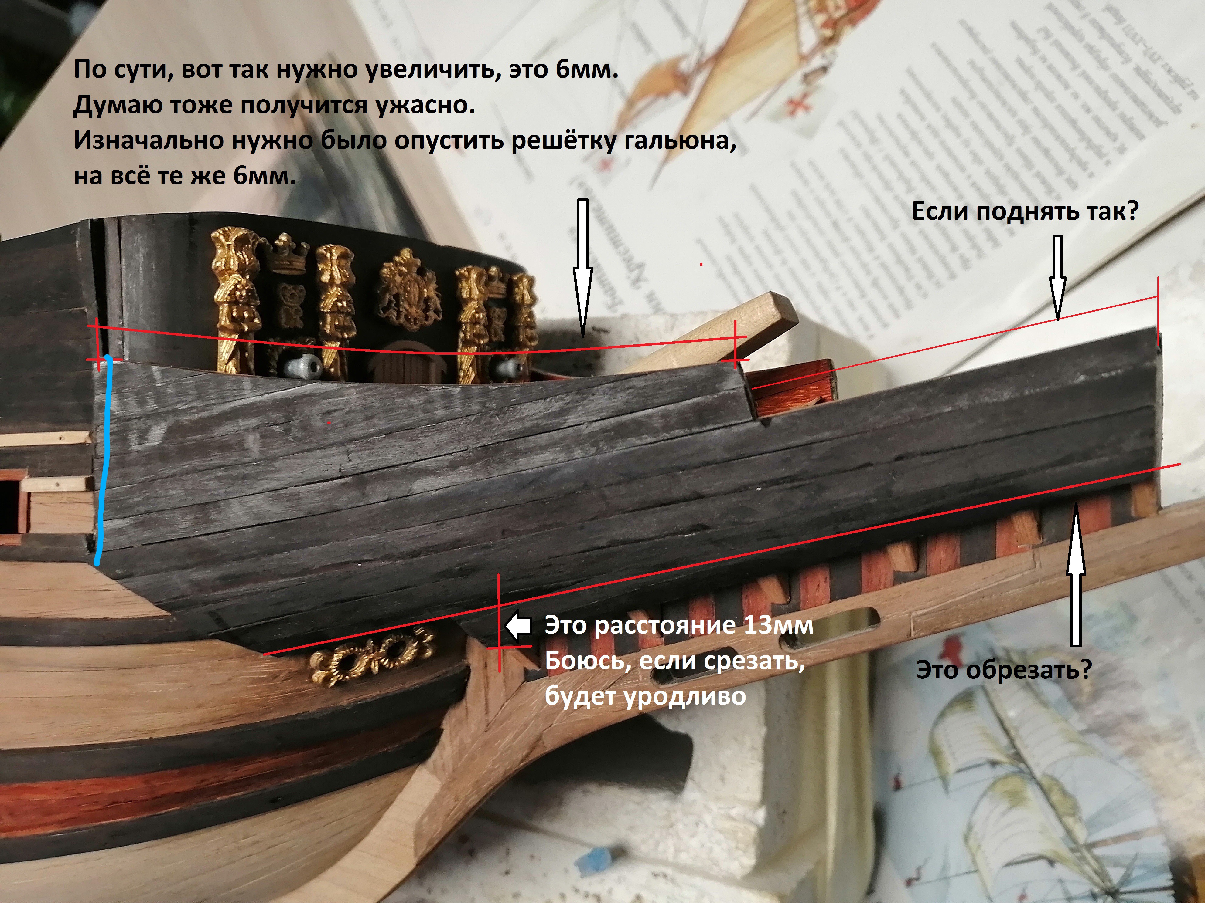 Ключевое слово здесь - "аккуратно снять..." Обшивка намертво приклеена, приколочена к корпусу и сшита(нагелями) между собой. Я уже писал, отодрать не проблема, есть риск сломать решётку гальюна. Восстановить её обратно не представляется возможным. Обшивка сделана в три слоя нижняя часть (до палубы гальюна) набрана из реек граба в перехлёст. Верхняя - основа фанерка из набора обшита в два слоя снаружи и один внутри.Алексей Владиславович Пономарёв писал(а): ↑16 янв 2023, 16:22 Если аккуратно снять всю обшивку и немного срезать по синей линии то возможно и получится приподнять на нужные миллиметры