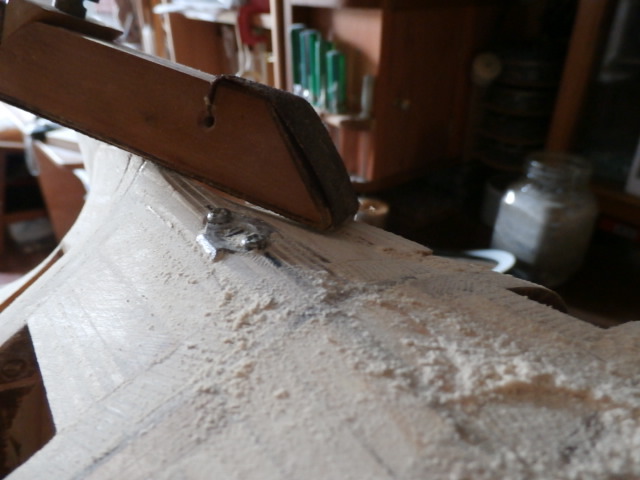 Добрый день, Сергей Николаевич! Продолжаю обшивать черновой обшивкой корпус. Уложил почти два пояса по 5 планок обшивки. На носу зауживал до 2,5 мм, на стыках делал замки (очень понравился вариант предложенный на форуме Raiden) Как ни старался, лесенка все же на носу присутствует. Корму пока не зашивал. Готовлю планки.
