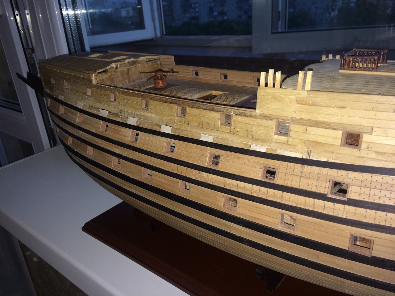 От себя добавлю, что вымбовки обычно пристегивались в вертикальном положении не далеко от расположения шпиля к фальшборту или на переборке какой либо рубки. На ваших фото , я думаю шпиль уже более позднего восемнадцатого века. У меня нет чертежей шпиля нашего корабля. Поэтому можно его представить только соотноша шпиль с 20мм фигуркой моряка патворка. Посылаю фото из интернета Российского, петровского военного корабля "Ингерманланд" 1715 года более позднего, построенного на полсотню лет позже нашего Повелителя.