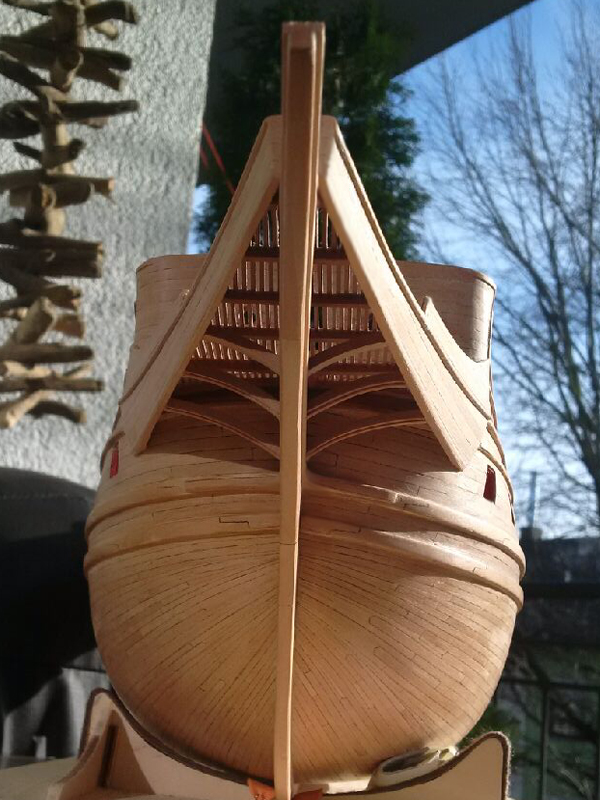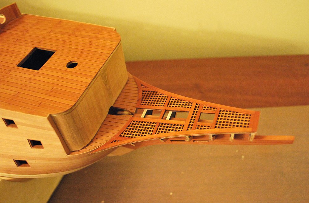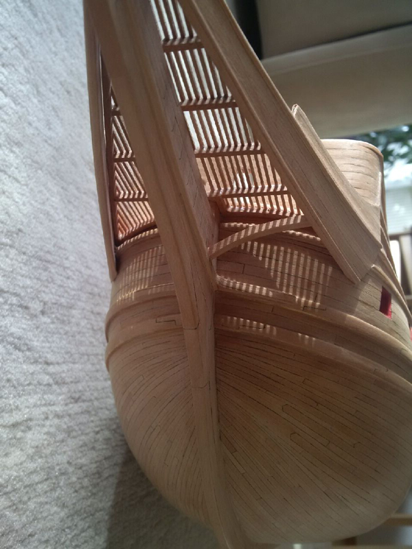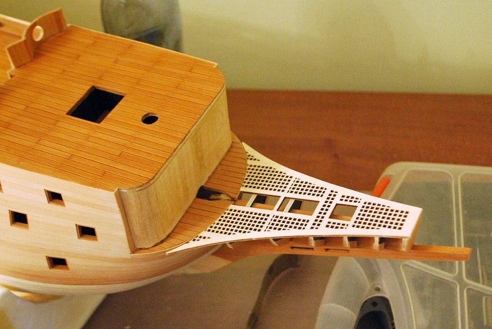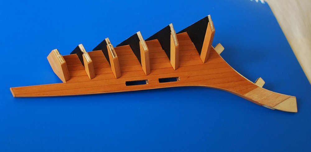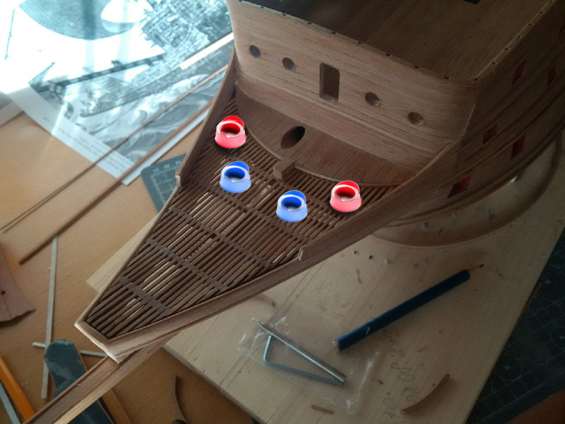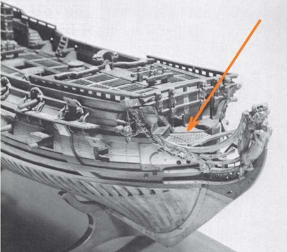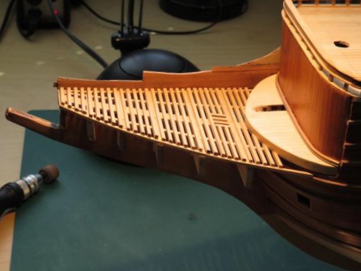 Что-то не нравится мне эта носовая рустерная решетка и то как она подходит к переборке бикхеда (вертикальной стенке). Рустер получается поверх палубы бикхеда, в то время как на исторических моделях он является продолжением полукруглого участка палубы. Да и другие моделисты делают у Повелителя эту палубу бикхеда открытой.