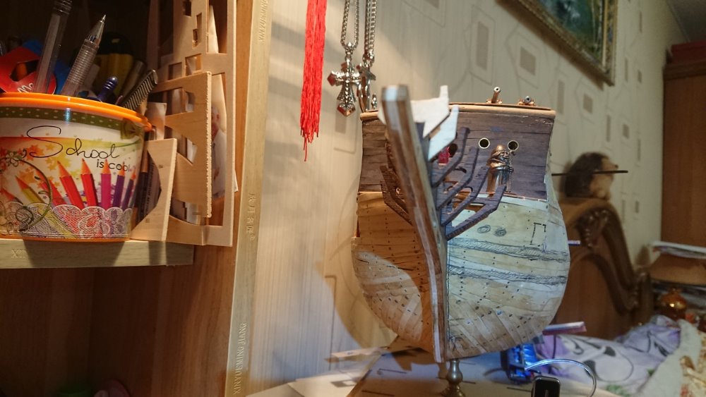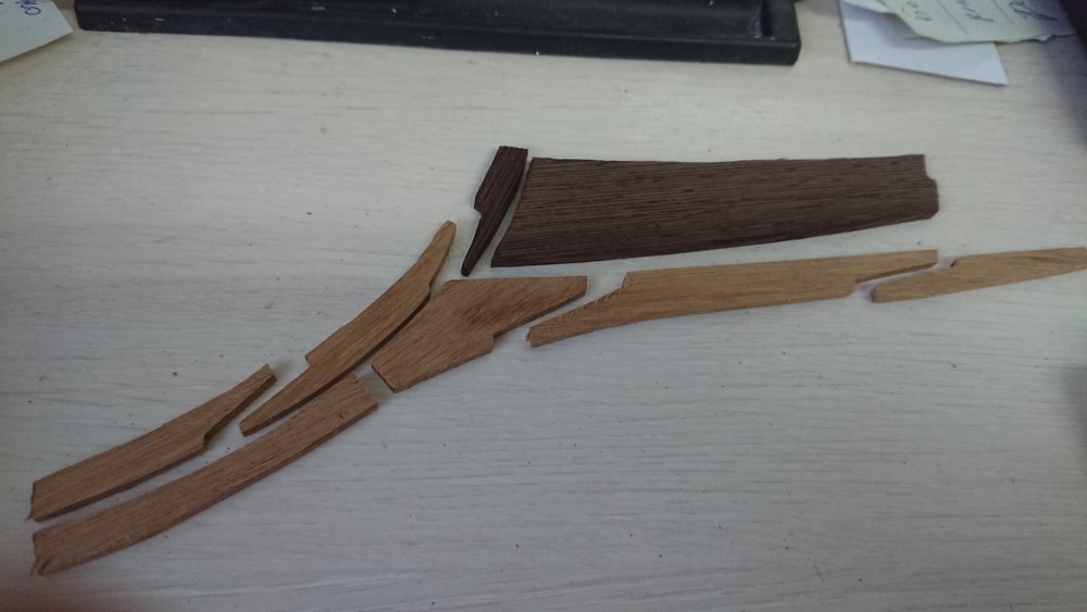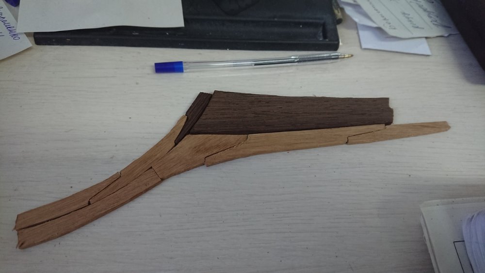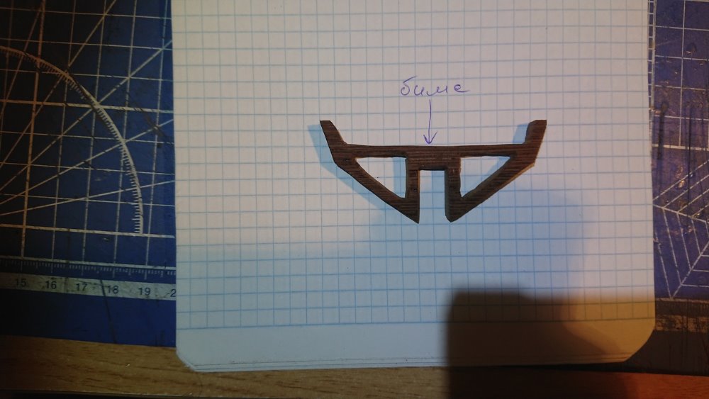Конструктивно я решил гед-ти мберсы фанерные заменить на дерево (венге). Примерно вот так я сделал самый первый большой гед-тимберс. Наглядно гед-тимберс походит на букву V, а горизонтальная линя служит бимсом, на него я буду устанавливать настил гальюна из реек 1,5 на 1,5мм.