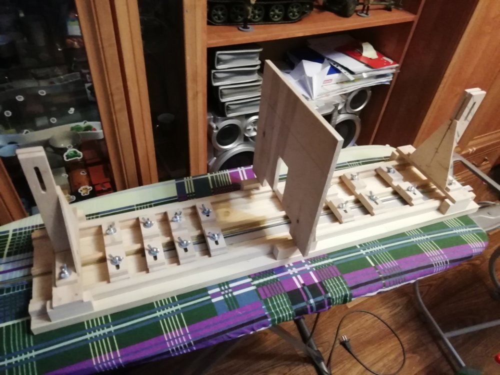 Чертежи этого стапеля брал из интернета. Они много где есть. Есть на верфи. В сети ходят под названием польского стапеля. он состоит из основания с направляющими рейками, зажимы штевней, зажимы киля и приспособой для перпендикулярной установки шпангоутов. Именно эту линейку (для установки шпангоутов и видно на вашем фото). чертежи где-то должны быть. Они из сети в PDF, но я делал собственные в автокаде, просто для проверки и чтобы понять как работает стапель. Оснований у меня 2. Одно 700мм, второе 1200-1300 (точно надо идти мереть). Маленький делал еще для Баунти, но он оказался коротким, штевни зажимались на самом краю, и я сделал длинное.
