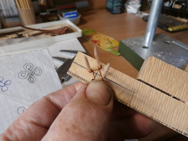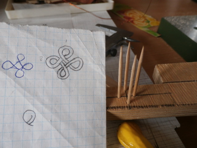 Сегодня я постараюсь написать, на мой взгляд, интересную для нас форумчан тему: о декоративном оформлении нашей модели. Если открыть постер, данный с первыми номерами журнала, то на бортах нашего корабля между артиллерийскими портами гон-дека и мидель-дека (первый и второй этажи корабля) укреплены кольца - обухи и рымболты держащие обухи. Смысл установки обухов мне не совсем понятный. Возможно они существовали для крепления дополнительных плавсредств (шлюпки, плоты ) во время стоянки или ремонта в тихой заводи корабля. Возможно для укрепления площадок (временных) и лесов во время ремонтн. работ. Мне идея разработчиков проекта в принципе нравится - как чисто декоративный элемент, заполняющий пустоту борта, Я же решил добавить от себя дополнительное украшение, изготовленное из тонкой медной проволоки (0,5 мм) взятой из катушки старого трансформатора радио. Вот что у меня из этого получилось: В центре проволочного креста будет укреплен обух в головке каждого рым-болта...