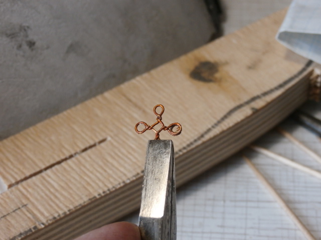 Для того, что бы получился именно крест, а не квадрат и для увеличения жесткости всей фигурки каждую головку перекручиваем плоскогубцами не снимая три остальных головки с кондуктора, этим мы делаем фигурки похожими друг на друга и оставляем в одинаковых размерах...