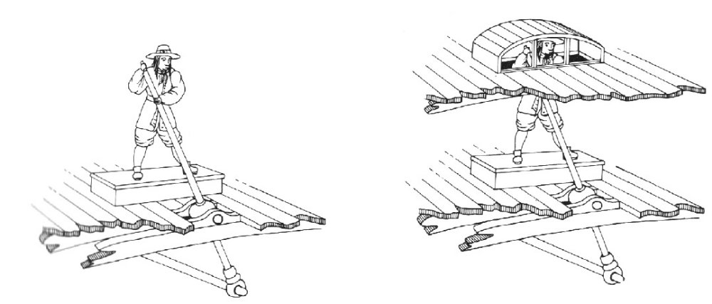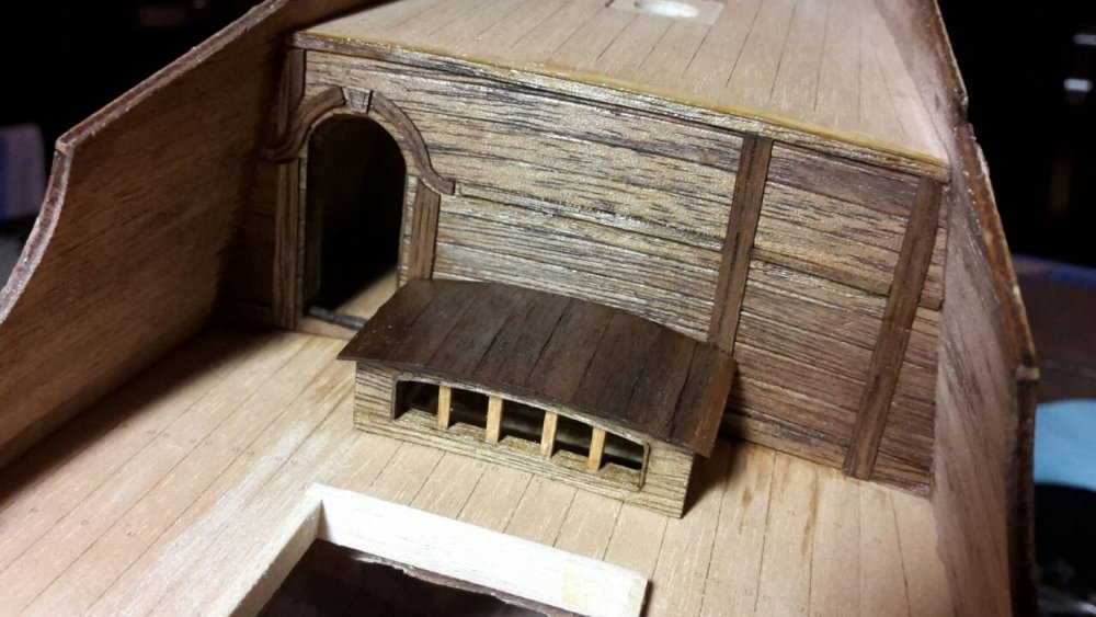 Давайте примерим на себя шкуру Питера Петта. Длина механического рычага колдер- штока не может быть бесконечна. Значит рулевой располагался где-то на юте на поп-деке или чуть ниже на квартер-деке палубы юта. Поп-дек - отпадает, это священное место адмиралов и даже самого короля и там уж, возможно, серой мышкой пробегал временами капитан, но уж ни как не матрос-рулевой с его плебейским запахом лукового супа и вонючими ногами. Так что думаю это квартер-дек или на границе между этими палубами располагалась эта - рулевая рубка. Конечно будет очень импозантно смотреться сооружение, чем - то напоминающее телефонную будку прошлого века по середине верхней палубы квартер - дека. Но увы не та эпоха! Стекло оглушающе - дорого! Только очень богатые монастыри , да и возможно король могли позволить себе это чудо да и то в виде россыпи цветных витражей, да и то только около алтаря - главного места любого собора... ДеА в кормовой надстройке использует золотистую мелкую сетку, я думаю как альтернативу мелких цветных витражей... Прятать рулевого под палубу, с маленькой будкой, не хочется. Модель не того масштаба. Для зрителя теряется и сам рулевой и устройство колдер-штока. Будка, же больше похожа на собачью. До изобретения фреоновой установки моряки в плавание брали различную живность, различных кур, поросят. Для них сооружали различные клетки и чтобы не обезображивать взгляд сиятельных пассажиров создавали эти клетки и оригинальными и даже красивыми, не считаясь со временем ни ценой. Так что мой вариант это открытая площадка - рулевой обнявший колдер-шток и какой - то упор для рулевого за спиной. Всё что я написал - это конечно мои фантазии, и как любой человек я могу ошибаться, а защита рулевого от непогоды? Кто и когда думал о здоровье простого матроса? Умрет или заболеет - найдем другого!