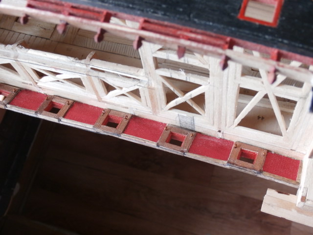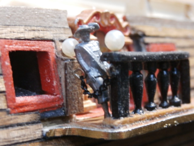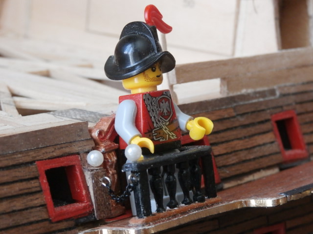 Свою проблему с балясинами на площадке перед "королевскими воротами" решил пока не менять кардинальным образом. Просто заменил окраску балясин от ярко белого цвета на черную. На фоне темно-серого борта так смотрится - скромнее. При изготовлении площадок на правом борту с балясинами буду более внимателен. Искренне благодарен AZET. Сейчас веду работы с остальными русленями левого борта. Кроме штатных трех русленей борта от патворка решил добавить еще два малых. Это для фордунов (стоячий такелаж) грот и бизань мачт корабля. Но работы пока еще ведутся и когда закончу я как обычно выложу на веточке. Успеха всем, кто забегает ко мне на веточку и конечно Здоровья!
