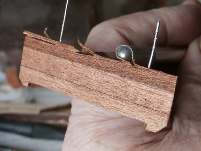 Борт модели оклеиваю планками орехового шпона 0,5 мм Х 3 мм Х 500 мм выписанные из интернет магазина. Верх оклеиваю черными 0,6 ммХ 3 мм 500 мм планками (бук)самостоятельно окрашенными морилкой цвета "Эбеновое дерево" и напиленными микромаркеткой. Использую клей ПВА -Момент Столяр D2