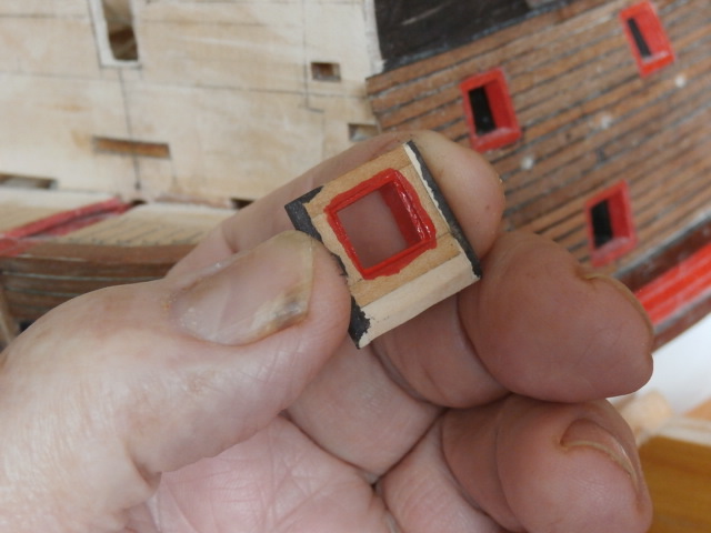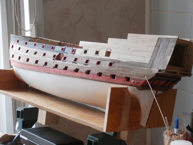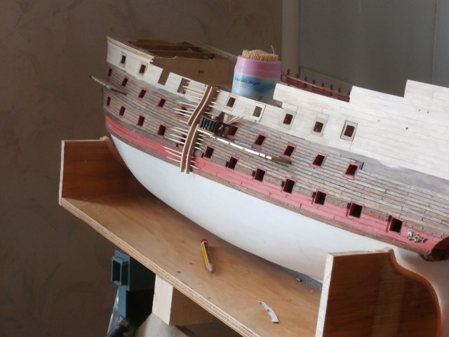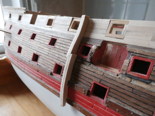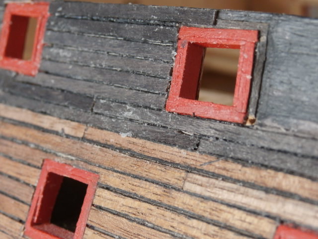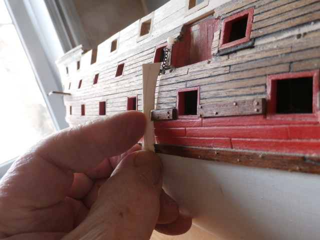 Работы веду на левом борту модели. Заканчиваю чистовую обшивку левого борта. Монтаж арт.портов опер-дека корабля.