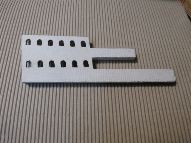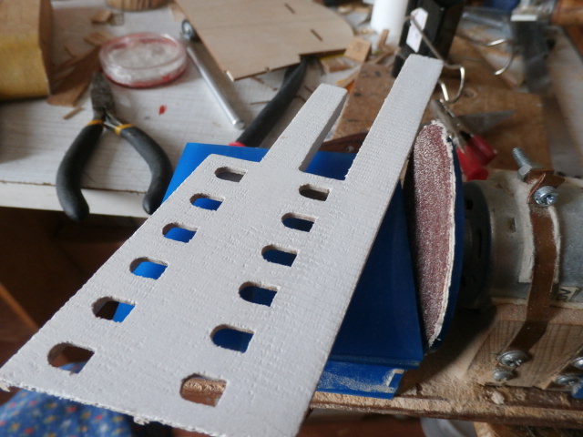 В принципе устройство не сложное, но когда конкретно взялся за изготовление - пришлось по возиться и повозиться от души. Дело в том что последняя третья от носа направляющая фендерса у меня выполняет еще одну функцию - забортного трапа для команды корабля.Сложность изготовления фендерсов заключается в крутизне и изгибе наружного борта корабля. Изгибать рейку с такими радиусами изгиба трудно, да и получить их одинаковыми все три очень сложно. Я пошел другим путём: Вырезал многочисленные кондуктора из картона, последовательно подгоняя каждый изгиб фендерса отдельно к изгибу борта Повелителя. Крепление фендерсов к борту будет при помощи мет.нагелей изготовленных из канцелярских скрепок , закрепленных секундным клеем.