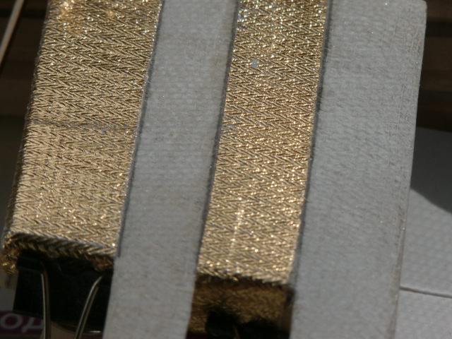 При сравнении тонкого китайского золотистого материала и просто золотистой акриловой краски останавливаюсь на материи от тех же Новогодних бантиков- мишуры для украшения Новогодней ёлки.