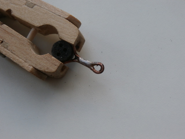 Крепление вант-путенцев должно быть максимально надежным. В верху цепь я вешаю на маленькое кольцо, стык которого я запаиваю эл.паяльником. Цепь у меня попалась довольно надежной, звенья которой не только прокрашены черной краской но и обработаны , я думаю эбокситным клеем. Возможно и все 2 в одном флаконе. = Возможно цепь окрашена жидким клеем с добавлением черной краски.Но в любом случае надеяться на прочность этой цепочки - не приходится. Это чисто декоративная деталь модели, не нужно рисковать, сильно натягивая цепочку...