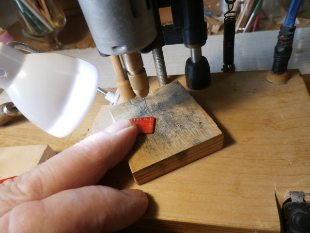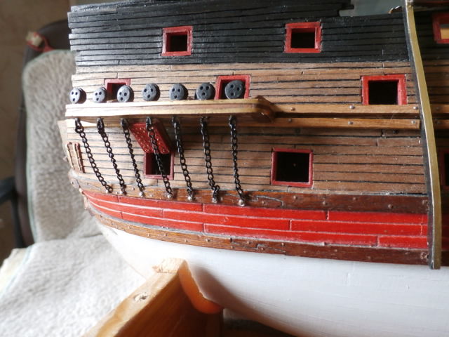Вант-путенсы вместе с юферсами на месте! Распределял юферсы на площадке при помощи обрезка шпагата и временной фок-мачты. (См. выше) Гнездо под вант-путенс выпиливал в теле площадки при помощи боковой грани плоского надфиля. Вклеивал при помощи секундного клея. Юферсы на фото только заморённые морилкой цвета "Эбен". Потом, уже на месте их отполирую нажд.бумагой разной зерн. и покрою акриловой краской черного цвета вместе с металлом вант-путенса.