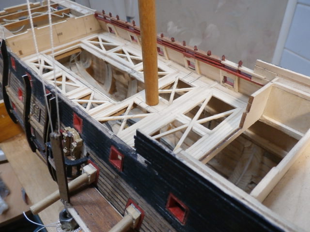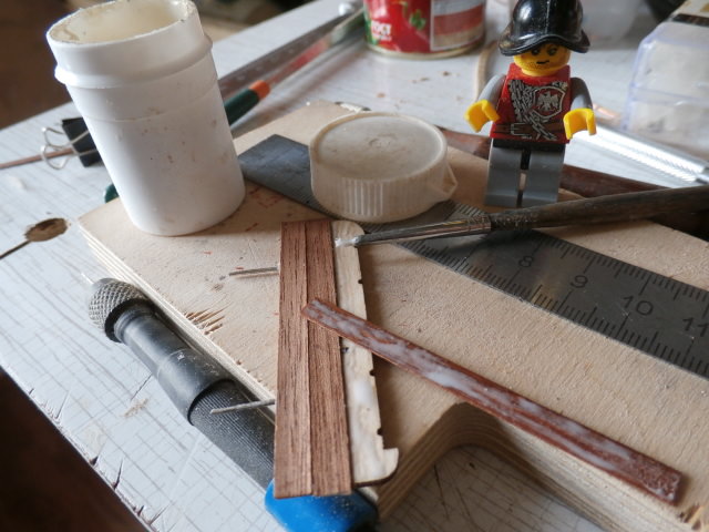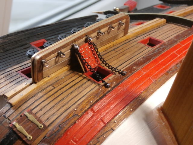 Работаю с носовым русленем по левому борту. Сама площадка пока не закреплена на борту, легко снимается и вставляется в свое штатное место при помощи метал. нагелей. Работать с деталировкой русленя в несколько раз проще, сняв её и положив на поверхность стола, чем , если она уже закреплена на своём месте...