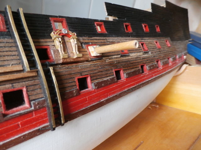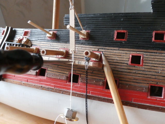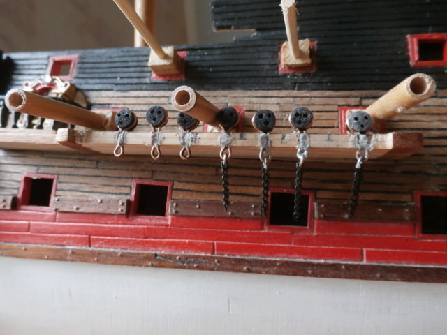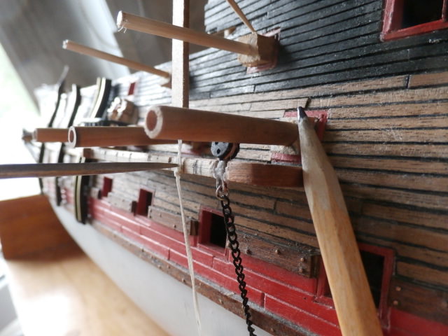 Изготавливаю вкладыши в пушечные порта модели из бросового материала - сосны. Вставляю в эти вкладыши длинные круглые буковые палочки, которые у меня временно будут играть роль фальш - пушек. Остается последнее - распределить равномерно пространство русленя так чтобы ванты и юферсы мачты не мешали в работе корабельных орудий.