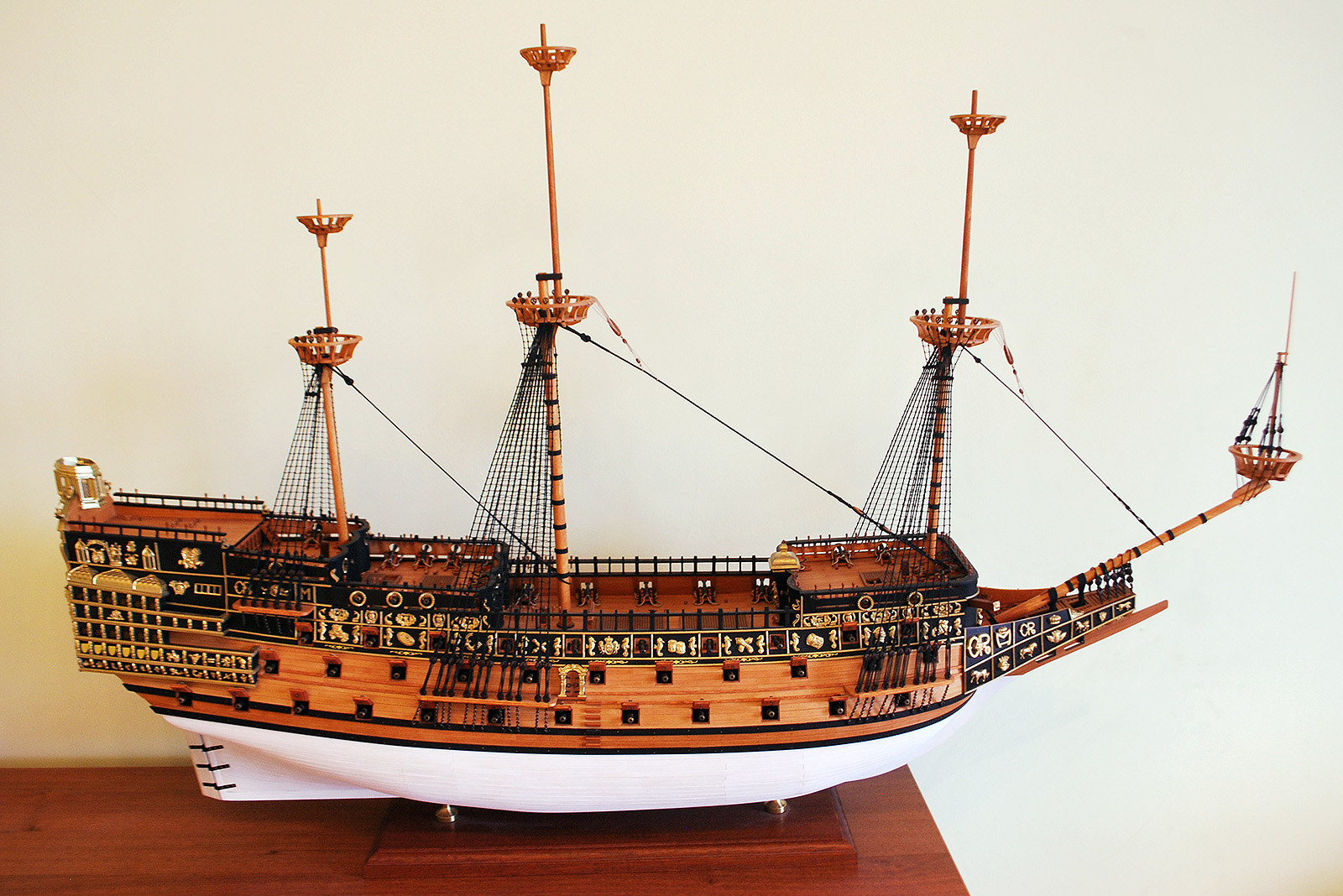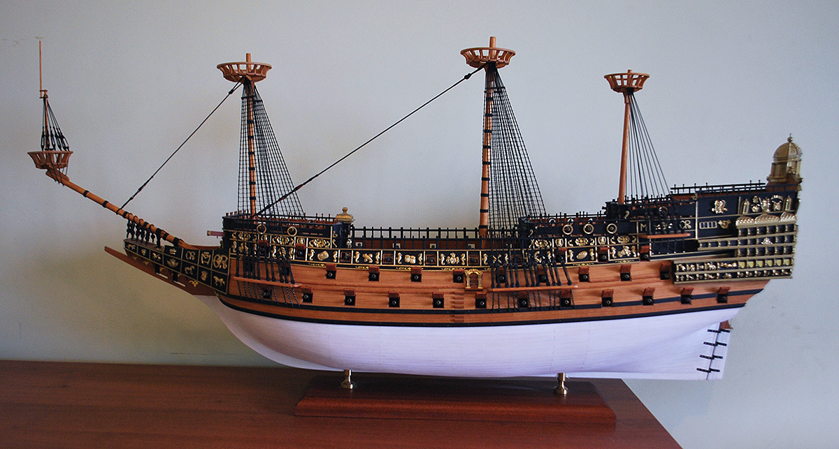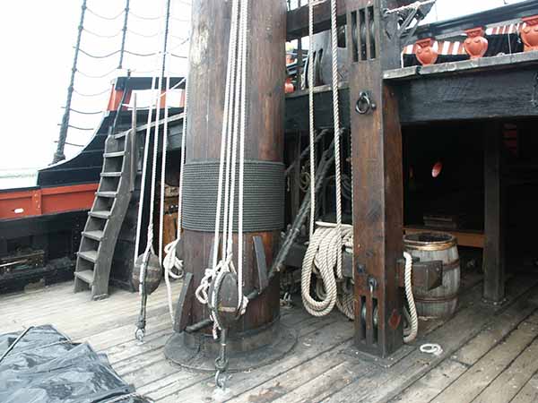 - мачты выставлены не строго вертикально, а как полагалось на галионах - фок с наклоном в нос, грот и бизань с наклоном в корму;