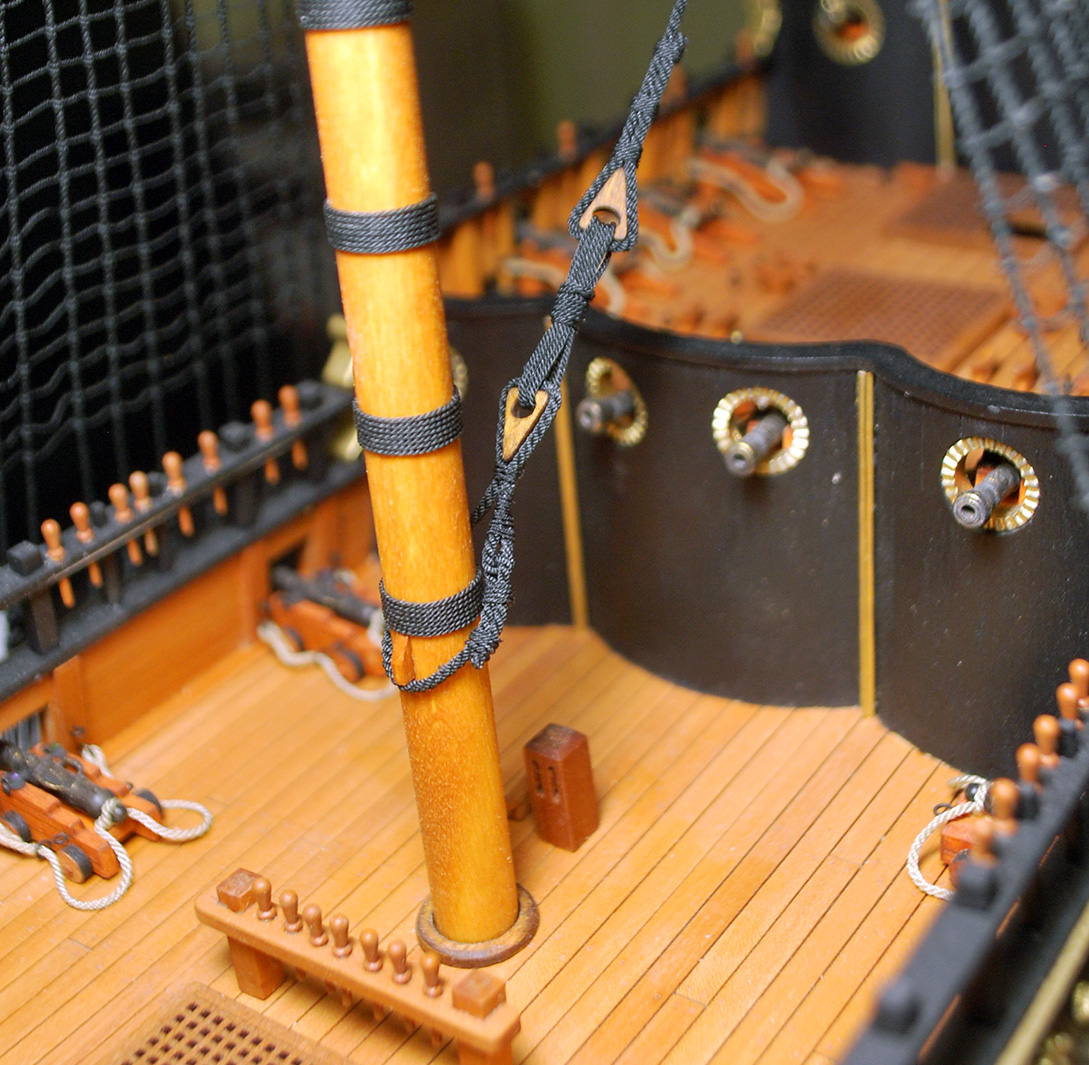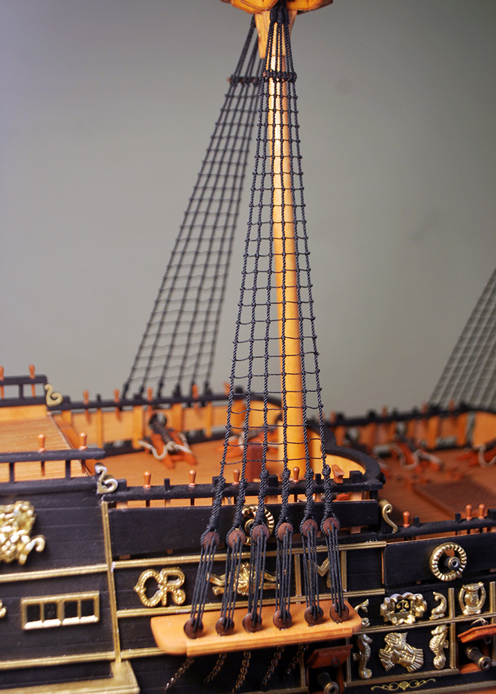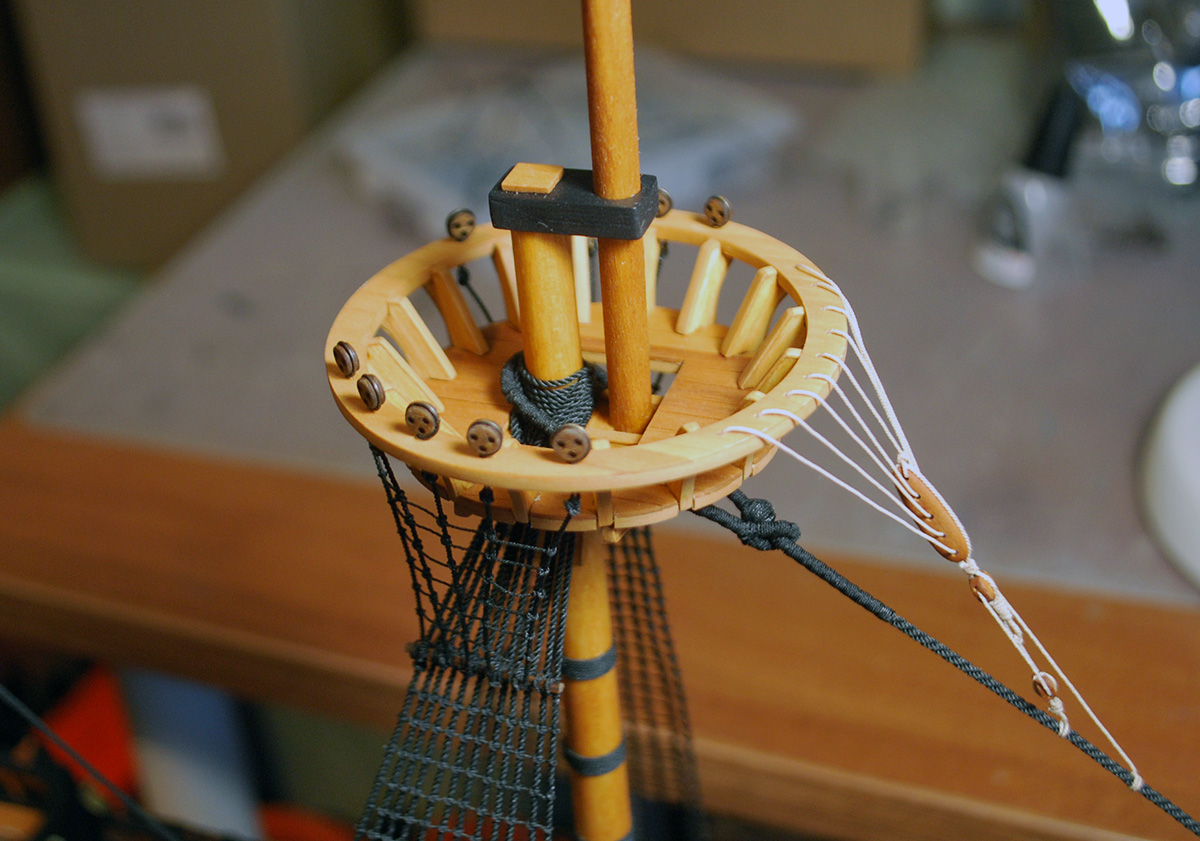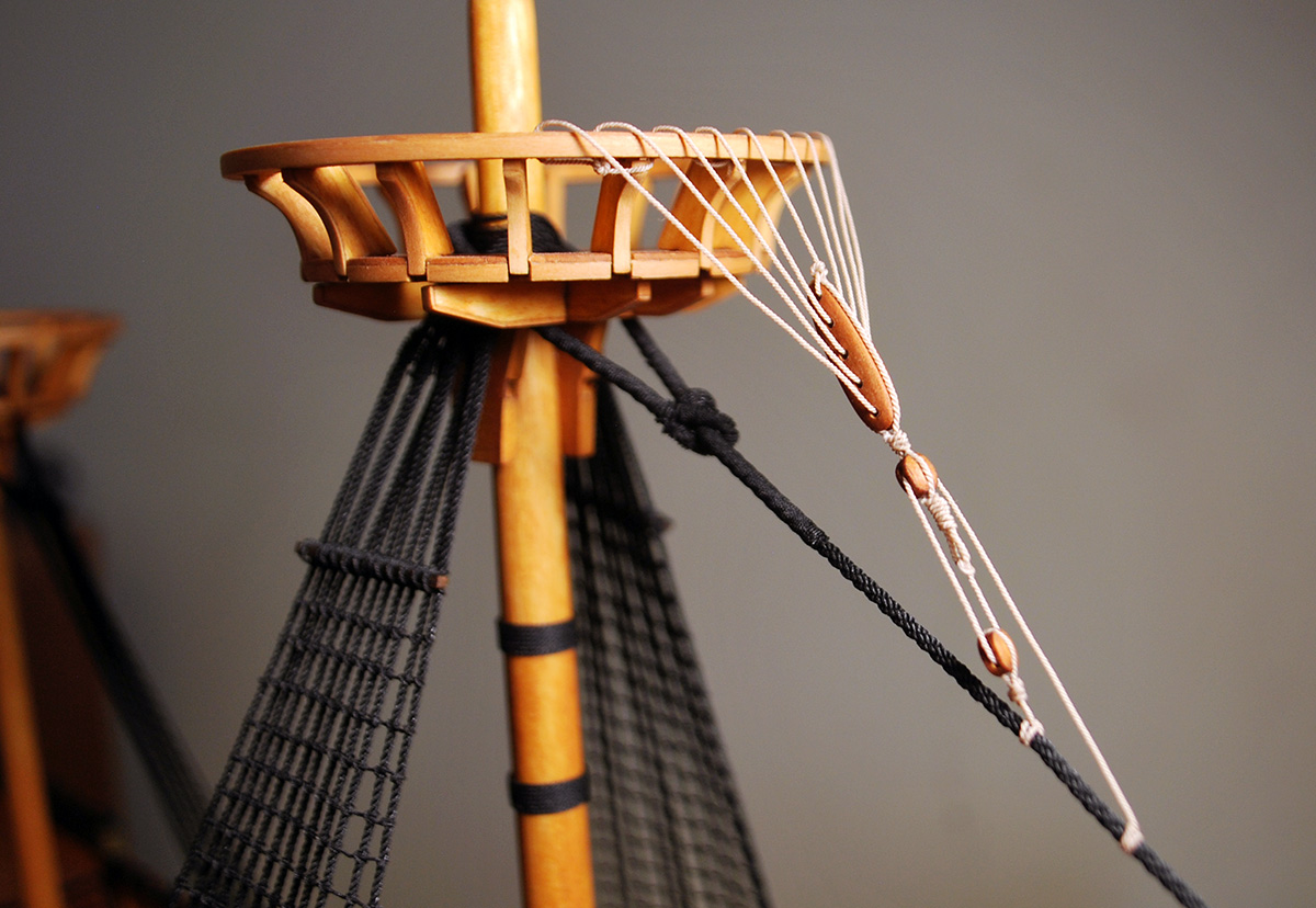 1001 выбленочный узел вант грот-мачты. Варианта только два - сойти с ума или выработать адское терпение. По мне, лучше уж выстрогать три корпуса, чем связать один такелаж. Опыта в вязании такелажа ноль, вяжу по шаблону и все огрехи налицо. На готовых вантах изъяны правда не так заметно.