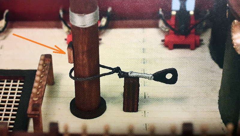 Подошло время ставить бизань-штаг. Еще при первом взгляде в 120 номер журнала мне не понравился стопор для краг-штага в виде чурбачка прибитого к мачте. Для кораблей позднего времени все было понятно - краг-штаг заводился под вулинг и деревянный бугель. Но на современниках Повелителя должен быть стопор, наделка на мачте. Его размер и форму хорошо видно на фото кораблей-реплик "Баттавия" и "Гото-Предистинация", исполнение которых заслуживает уважения.