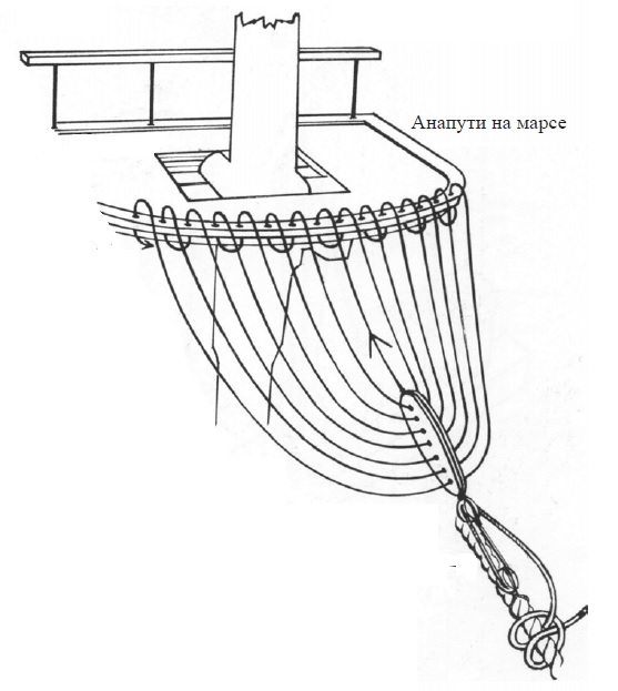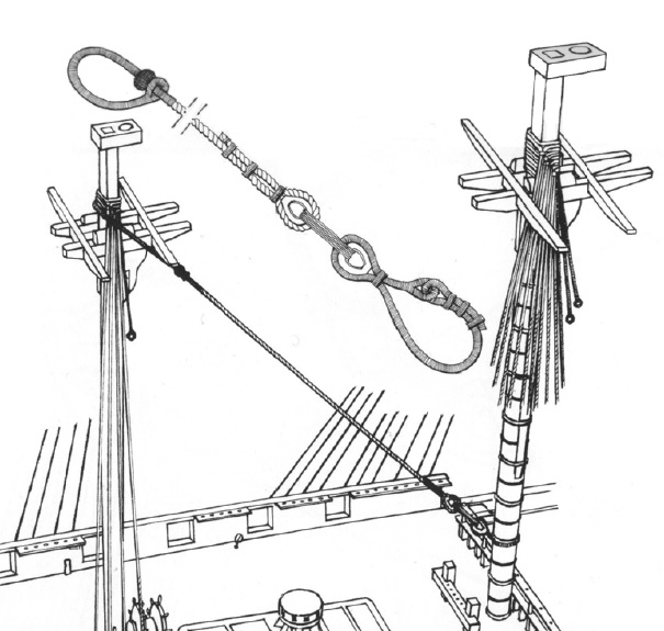 Когда делал бизань-штаг смотрел в Петерсона. Со стопором краг-штага получилась такая картина. Теперь изучаю, кто такие анапуть-блоки. Сколько пересмотрел изображений блоков и их проводок - везде все по разному.
