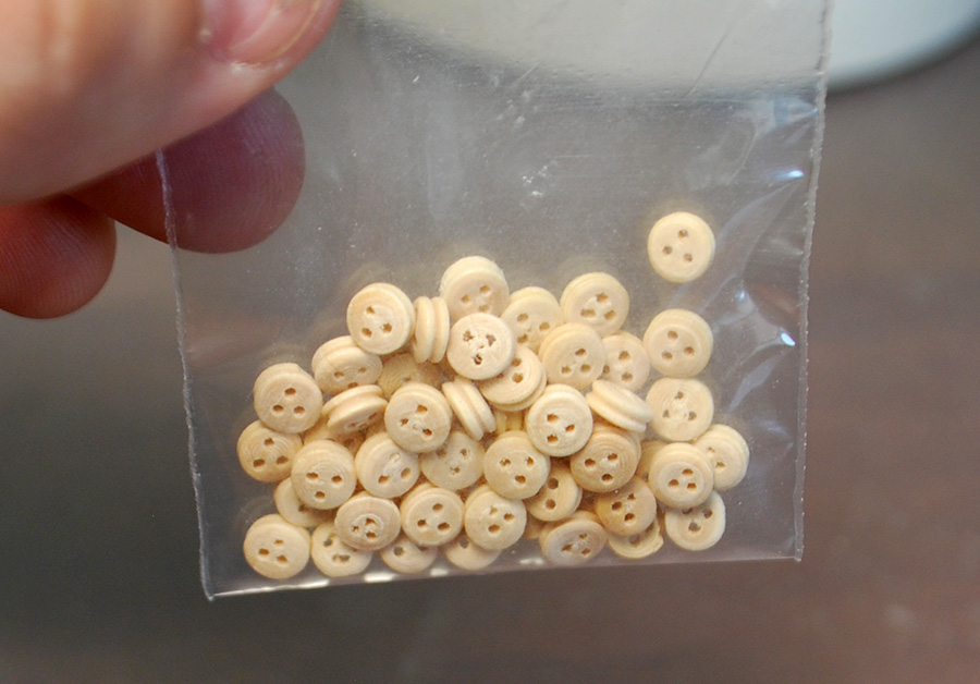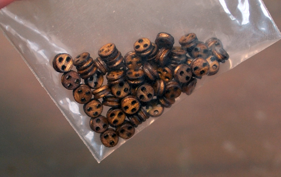 Оценивая ситуацию как безвыходную, достал фанерные юферсы из журнала. Неделя надфилинга и шкурнинга, тонировка под цвет кофейного зерна. В принципе, торец получился неплохо, а боковина текстурой выдает, что это фанера. Но ... масштаб нас спасет, все таки они очень мелкие.