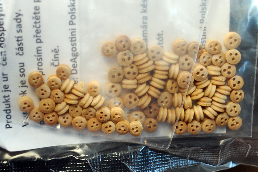 Сегодня поговорим о юферсах. Фанерные юферсы из журнала конечно позор производителя Артенсании, уровень очень дешевых китайских наборов. Большие юферсы 5 мм я купил легко, а вот с размером 4 мм вышла проблема - нигде нет. Фальконет, у которого я обычно приобретаю мелочевку, делает только 5 мм и 3,5 мм. Но 3,5 мм у них точно в размер, мелкие такие клопы. Искал на Али-экспресс, но китайцы уж больно много хотят денег - с доставкой под 500 р и это за 20 шт. А мне надо 56. Да и качество у китайских производителей посредственное. На фото видно, что отверстия просверлены не по шаблону, а видимо на коленке.