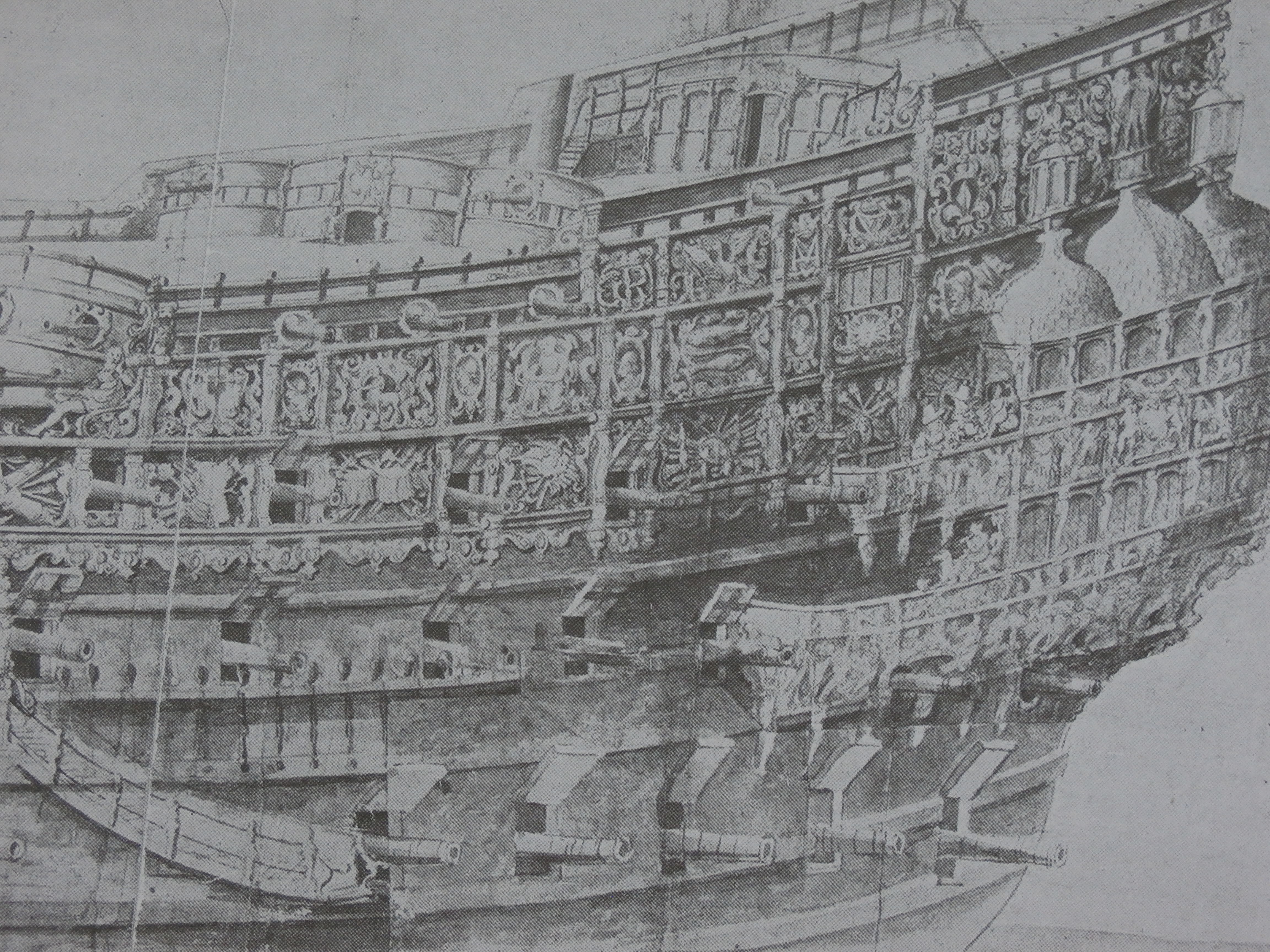 Как я понимаю, речь идет о книге Джона Мак Кейна. Я внимательно перелистал всю книгу но все рисунки и чертежи помещены на страницах книги со стороны правого борта. Видно левый борт корабля подразумевается как зеркальный - правому Есть только старинная гравюра, где изображение корабля показана левым бортом. Но к сожалению качество гравюры не слишком четкое, я сфотографировал. Удачи Вам и здоровья!