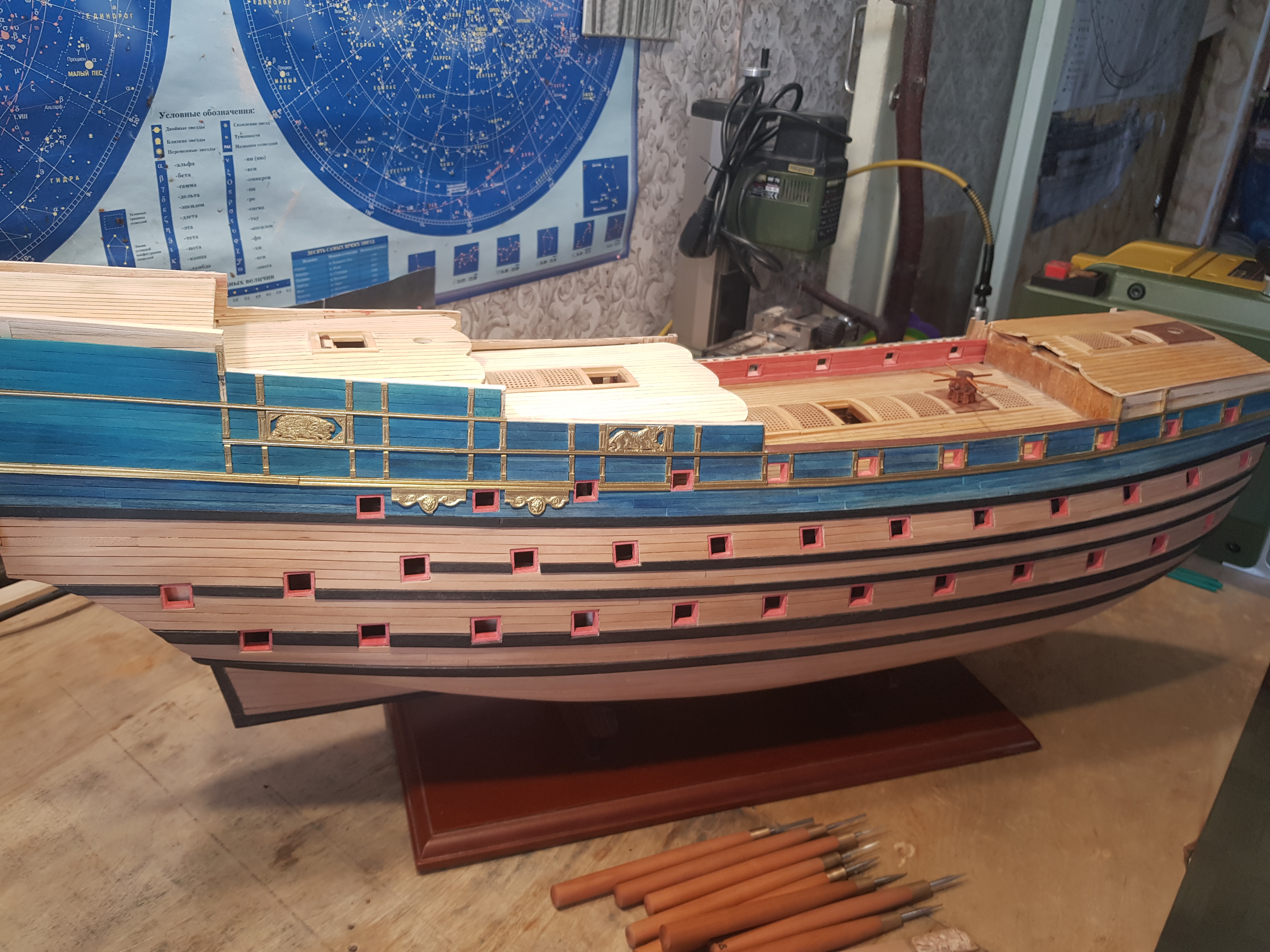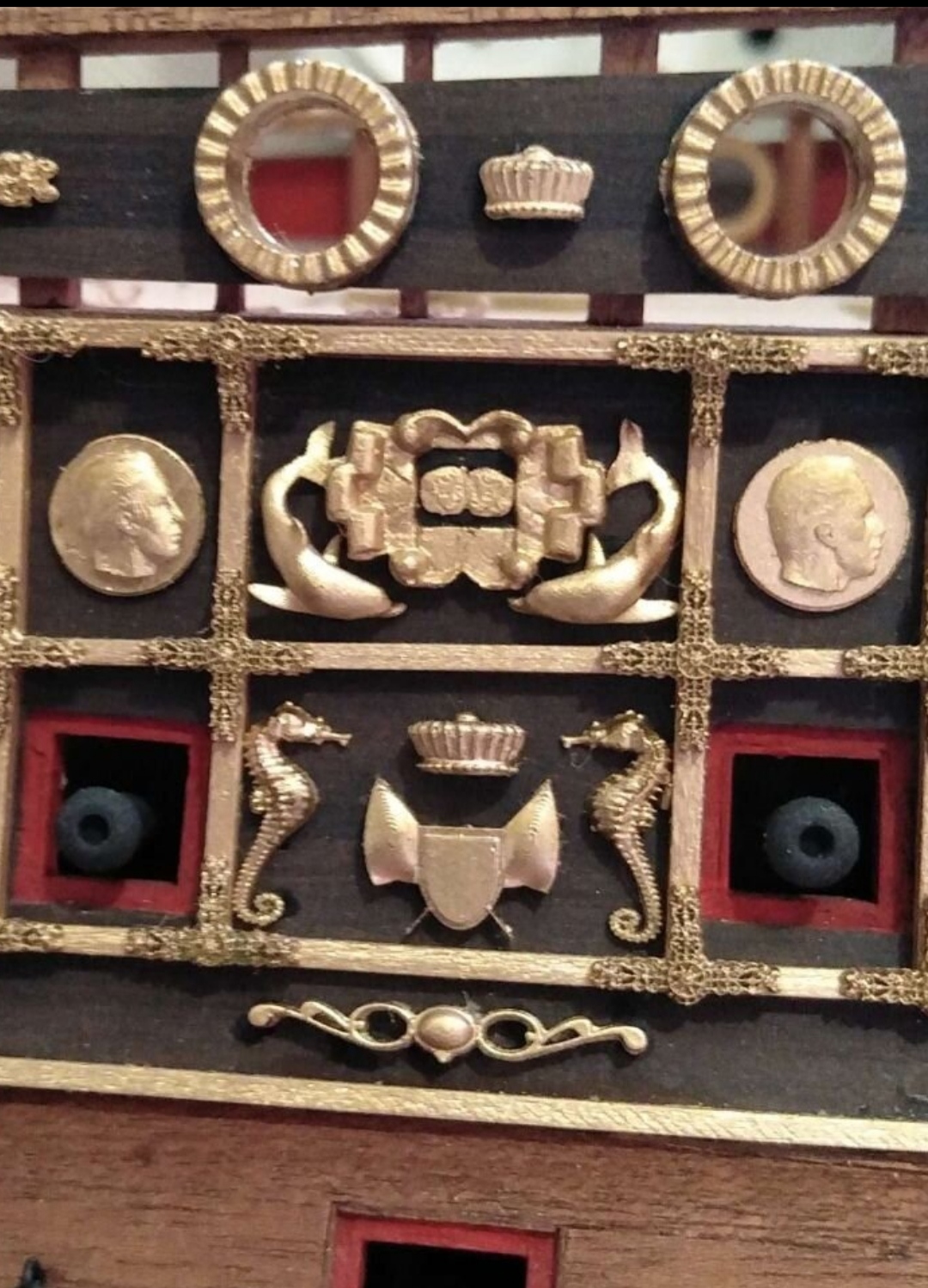 Покраска декора золотой краской предусмотрена ,пошёл все таки таким путём ! Внутренняя обшивка и порта орудий использовал стабилизированный красный граб ,сам не красил ! И верхняя обшивка стабилизированным синим грабом ,сам не красил ! Бархоуты черный граб , обшивка корпуса груша !