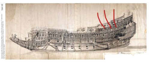 Как я понимаю, речь идет о книге Джона Мак Кейна. Я внимательно перелистал всю книгу но все рисунки и чертежи помещены на страницах книги со стороны правого борта. Видно левый борт корабля подразумевается как зеркальный - правому Есть только старинная гравюра, где изображение корабля показана левым бортом. Но к сожалению качество гравюры не слишком четкое, я сфотографировал. Удачи Вам и здоровья!