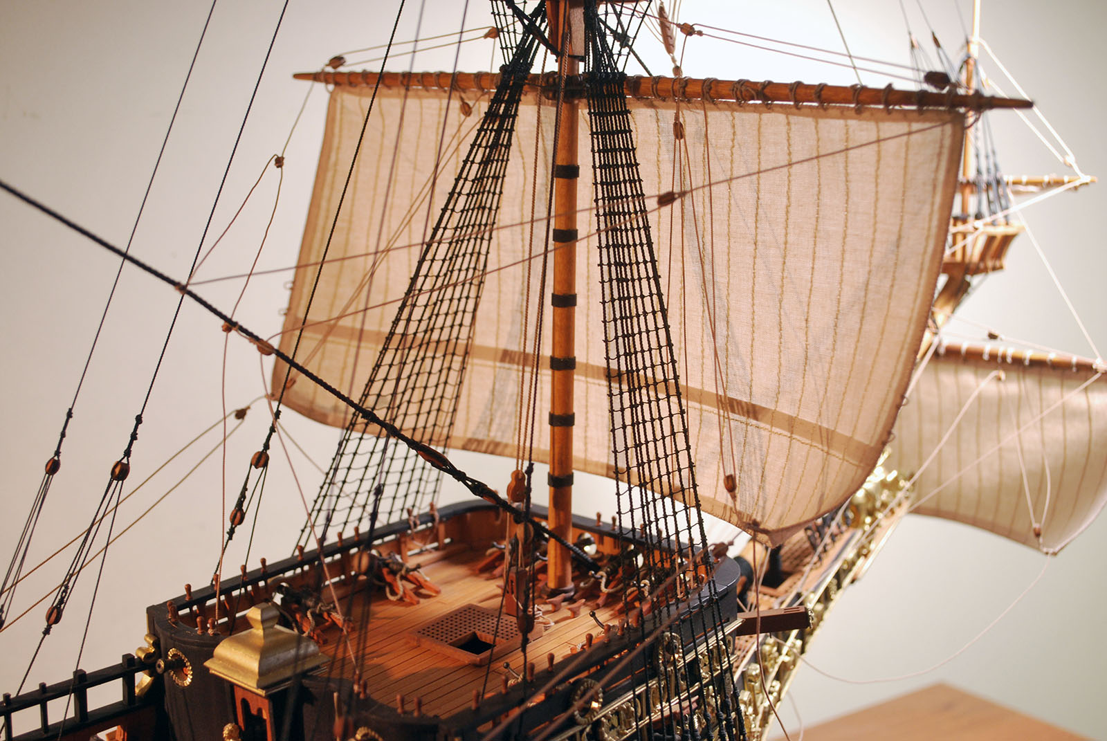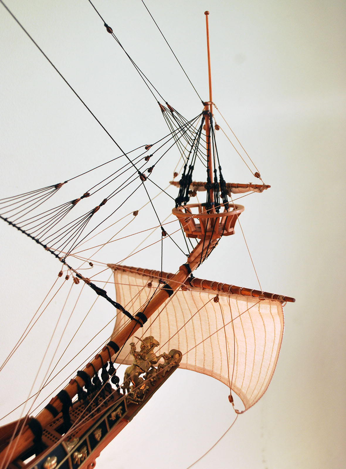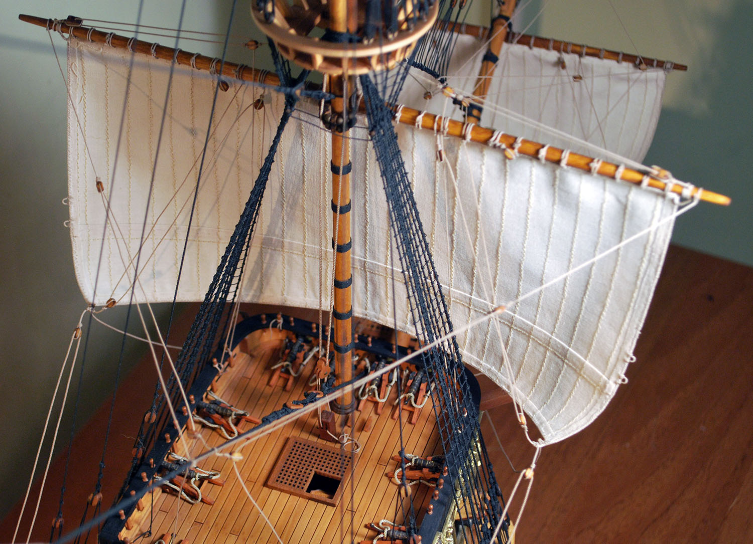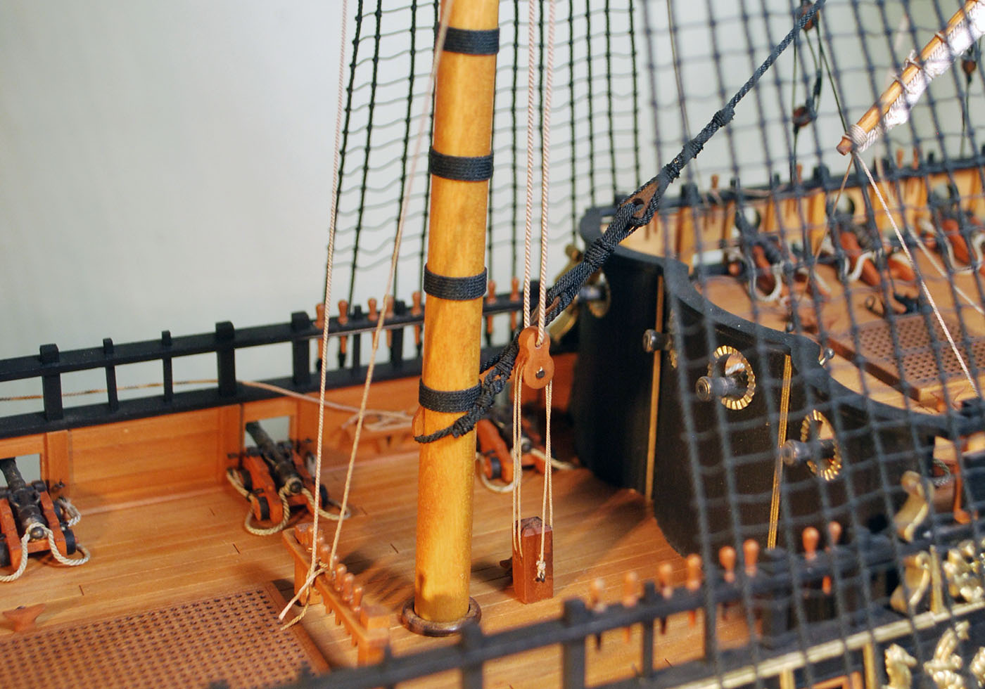 Из интересного только проводка драйрепа рея нижнего паруса - сделана через шкив-гаты в чиксах на английский манер, а не на континентальный, через эзельгофт, как предложено в журнале.