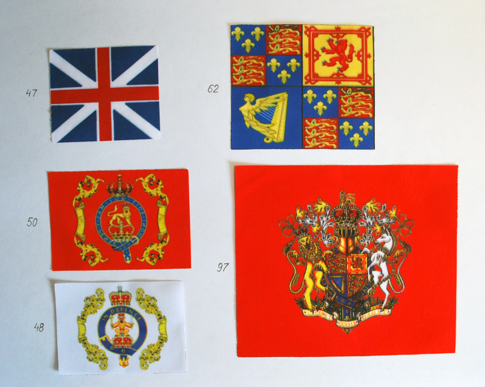 2. Не факт, что настоящие флаги были двухсторонние. Я не знаю технологии того времени по изготовлению флагов. Наносилась ли краска только с одной стороны, вышивались ли какие-то элементы, но вот обнаружил в книге Джона Франклина «Адмиралтейские модели кораблей 1650-1750» такой фрагмент. На исторических моделях флаги не из ткани, а из тонких листов латуни, раскрашены красками. Так на обратной стороне отрисовано зеркальное изображение, что предполагает, что краску наносили только с одной стороны ткани.